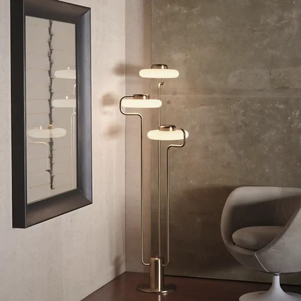 The Tratto LED Floor Lamp from kdln offers a mix of slender form and rounded edges, giving it a warm, intimate character. Designed by Oliver Schick, its cylindrical base anchors a series of slender arms that arc over and inward, each supporting a flat diffuser of mouth-blown opal glass. Inside, efficient LED lighting provides steady service, softening direct light into an inviting glow. A touch dimmer enables precise adjustment, striking a balance between character and control in a design that merges softer retro style inspiration with contemporary clarity.