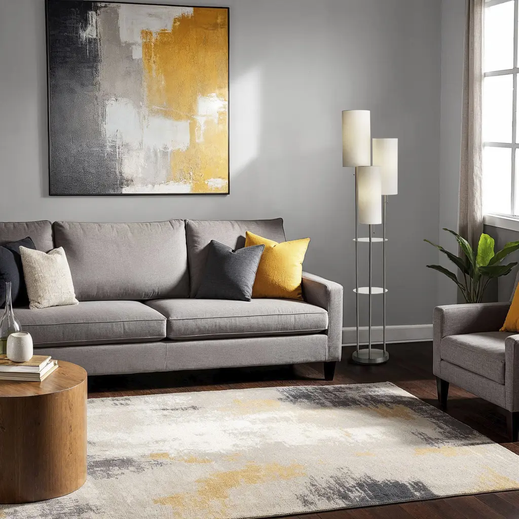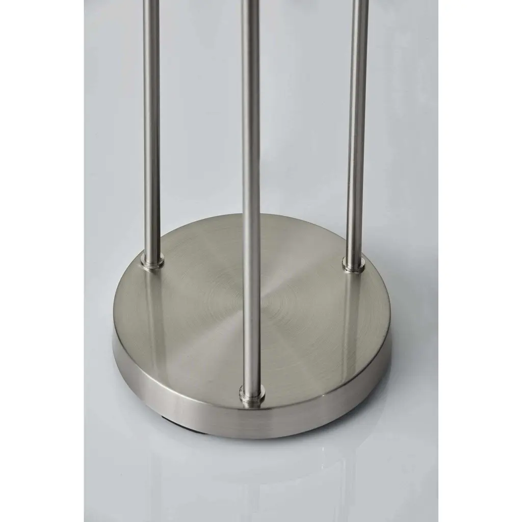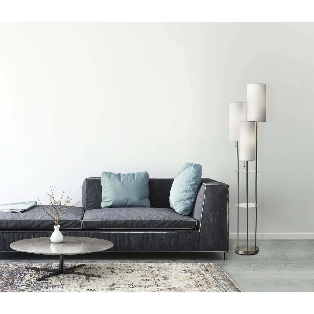 This satin steel floor lamp has three vertical poles that extend from the round base, each ending in a socket that supports a white linen cylinder shade. The poles support two clear 9.5" Diameter acrylic shelves, located at 18" and 32" Height from the base. Each shade has a ball-accented pull-chain switch and takes one 40 Watt incandescent or 13 Watt CFL bulb. 67.75" Height, 14" Width, 10" Diameter base. Shades are all 15" Height; 7.5", 6.75" and 6" Diameters, respectively, so they nest for shipping.