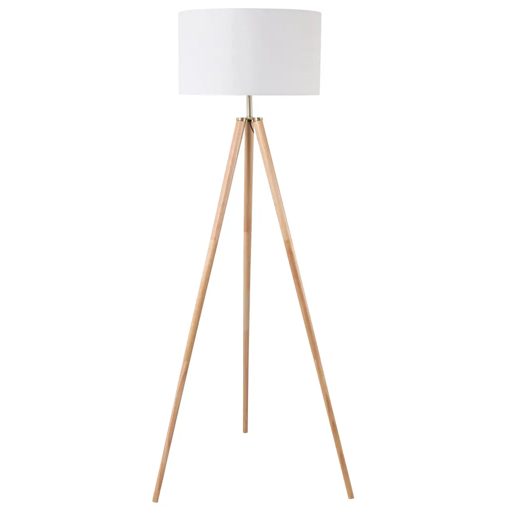 Illuminate your space with this floor lamp's stunning mix of materials and geometry. A natural wood tripod base that highlights the wood grain supports a simple linen drum shade. The lamp is easily turned on or off with a rotary switch by the socket. Clean natural wood finish Simple Off White Linen Shade 150 Watt or LED equivilant On/off rotary switch for your convenience
