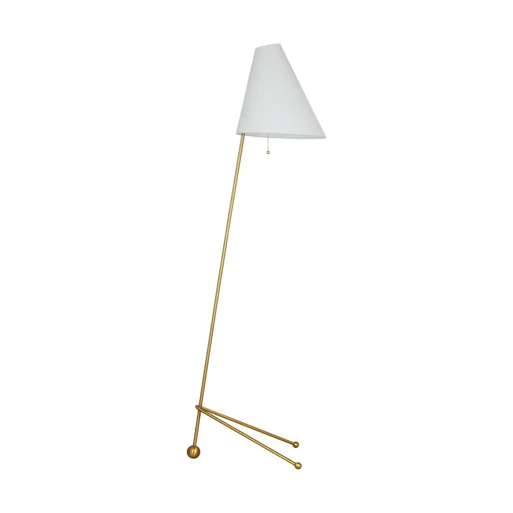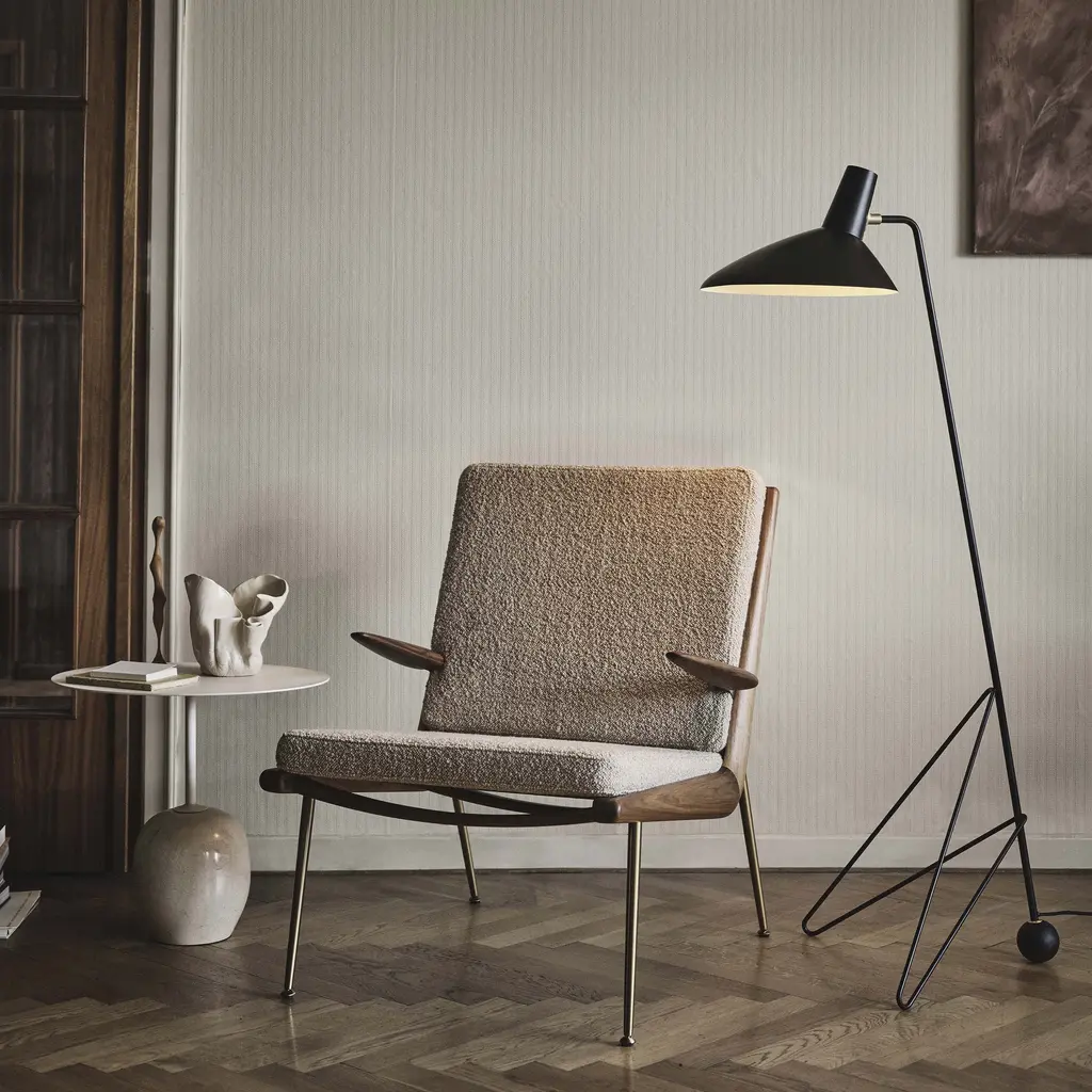 Tripod from 1953 reflects the clean minimalism of Old Masters Hvidt & Mølgaard. A floor lamp built from lacquered steel with brass details, it strikes a delicate balance between the stark simplicity of its design and the softness injected by the curved edges of its base. Although it was designed in 1953, this is the first time it’s in production. Features