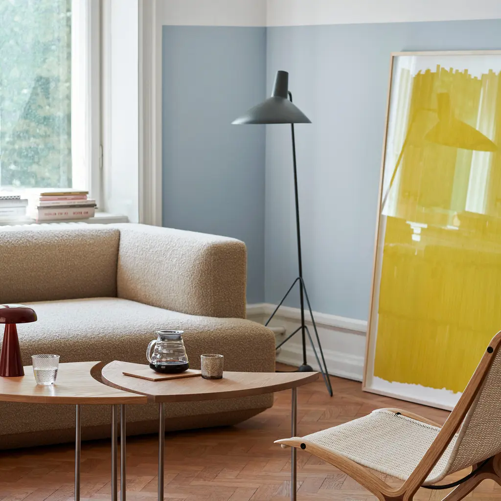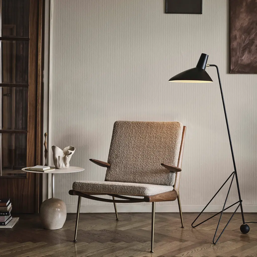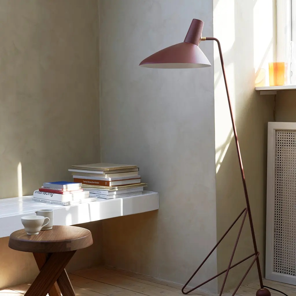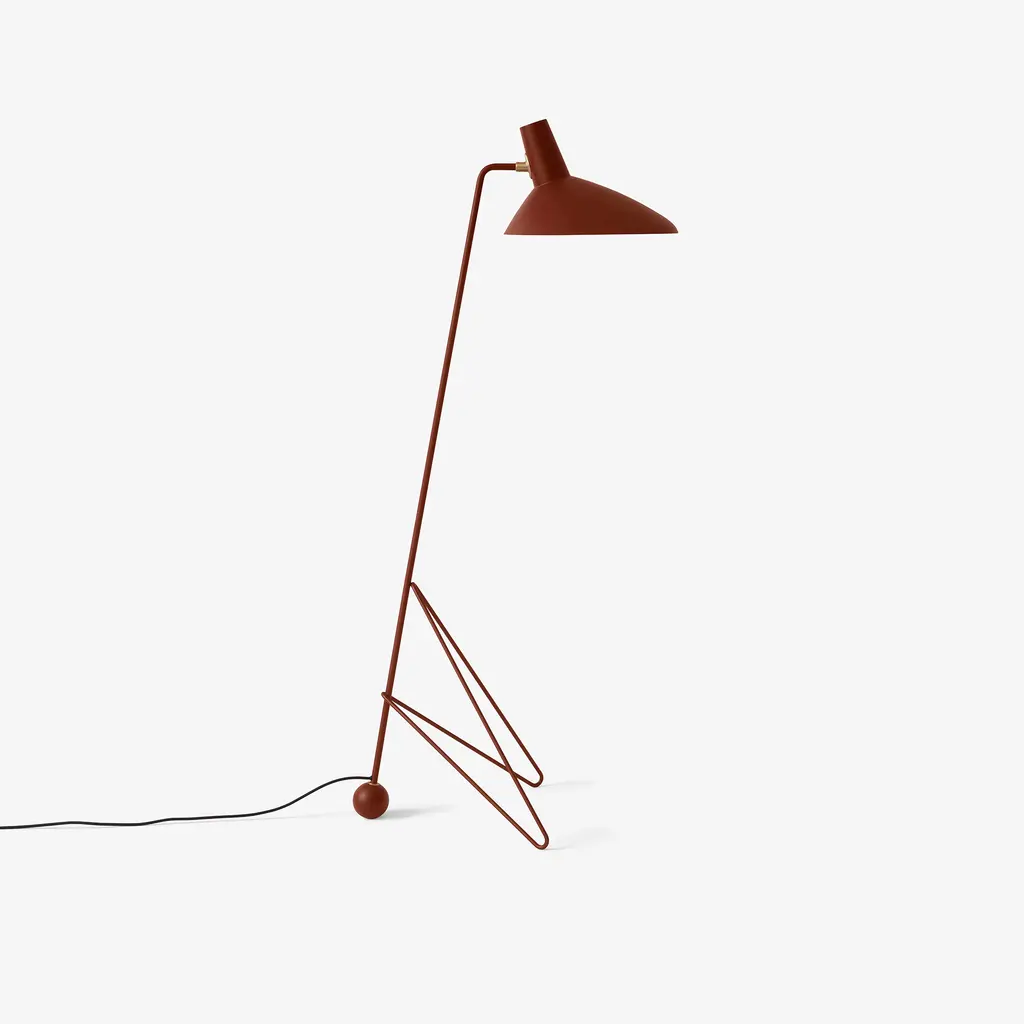 Introducing the “Tripod”, an exemplar of timeless elegance and minimalistic design originally conceived in 1953 by the celebrated Danish designers Peter Hvidt & Orla Mølgaard-Nielsen. This floor lamp, only now released into production, retains a powerful charm with its simplicity and its embodiment of the classic mid-century design ethos. Crafted from the finest lacquered steel, this lamp is not only striking in its aesthetic, but it’s also built to stand the test of time, ensuring a remarkable degree of longevity. The shimmering brass details act as a delightful counterpoint to the understated matte finish of the steel, introducing a dash of subtle luxury that beautifully complements any setting. Read more What sets this lamp apart is the harmonious balance between its streamlined, minimalistic design and the gently curved edges of its tri-pod base. The design softens the stark simplicity of the lamp, lending it an inviting and warm character. Its quiet elegance will seamlessly integrate into both traditional and modern interiors, providing not only illumination but also a sophisticated decorative element. For the first time since its original conception, this architectural piece of lighting is now available for purchase. It’s offered in a palette of three contemporary, yet versatile, colours: a classic Black that exudes an air of sophistication, a rich Maroon that provides a warm and inviting ambience, and a fresh Moss shade that can inject a lively touch into any décor.