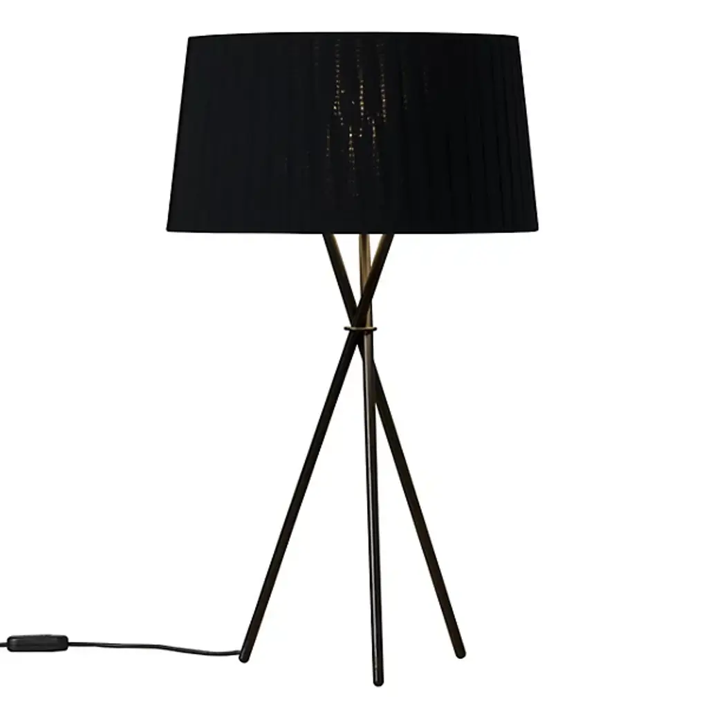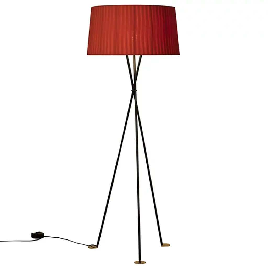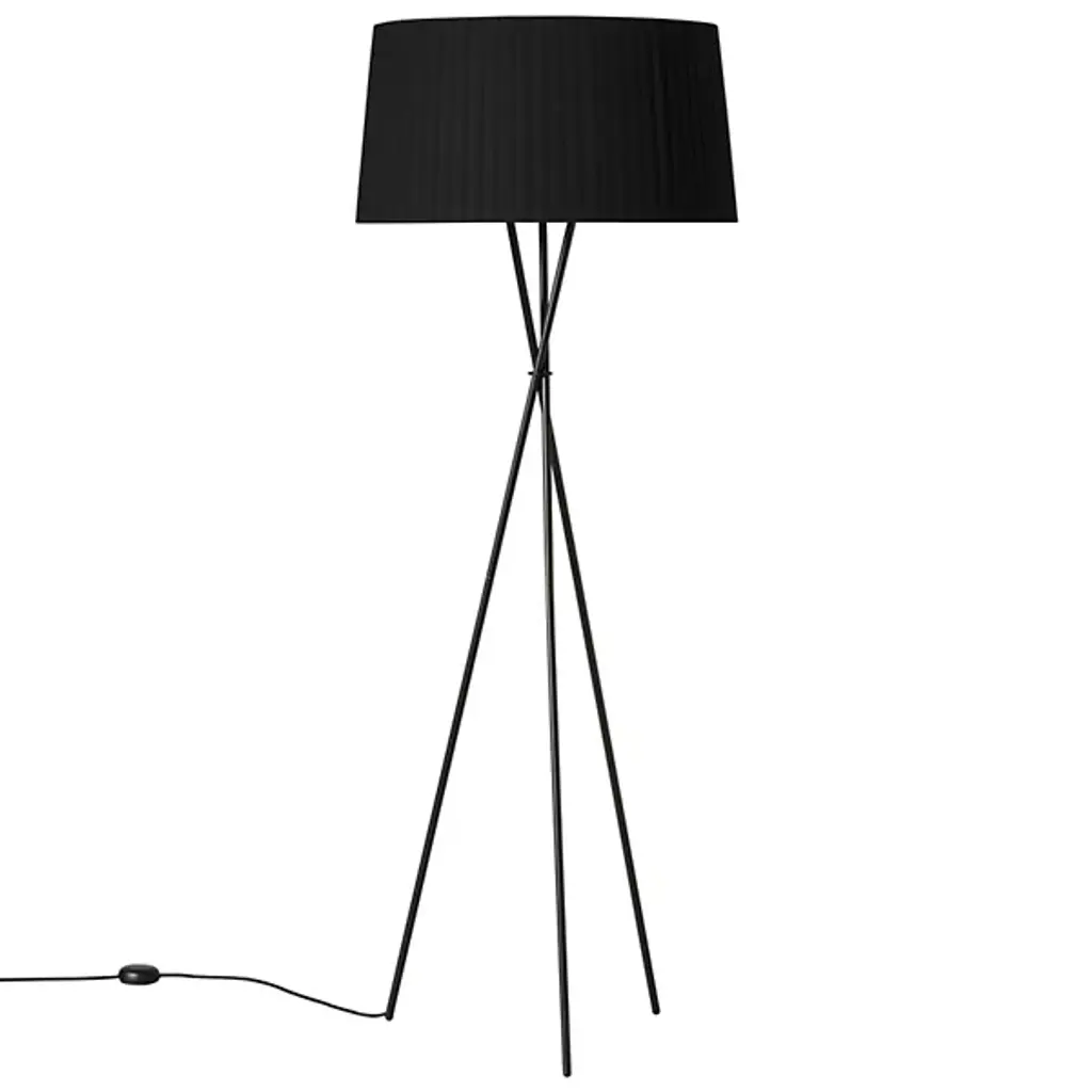 The Santa & Cole Tripode G5 Floor Lamp, is a contemporary beauty dressed in traditional clothes. As classic as the black cocktail dress, the Tripode G5 Floor Lamp, with the large, drum-shaped, cotton-ribbon lampshade, is no shrinking violet. Its presence can define a lost corner and give substance to interior decor. Designed in 1997.