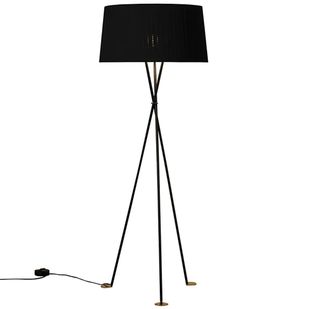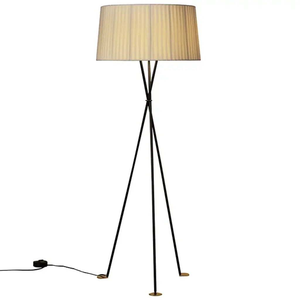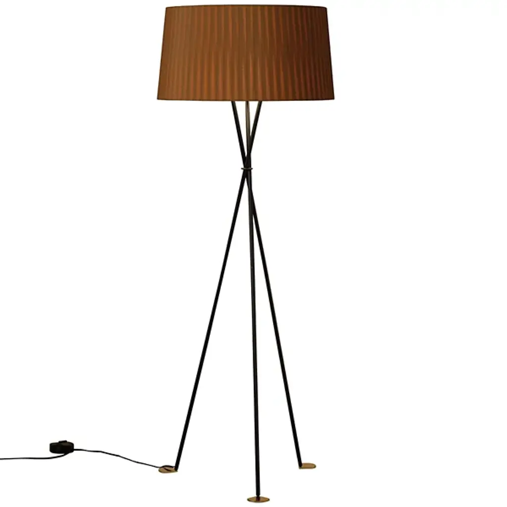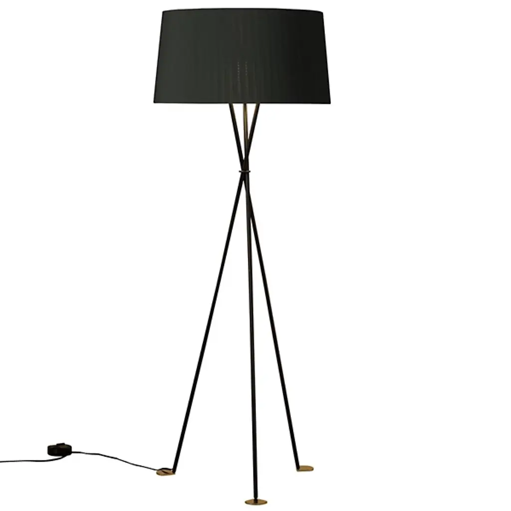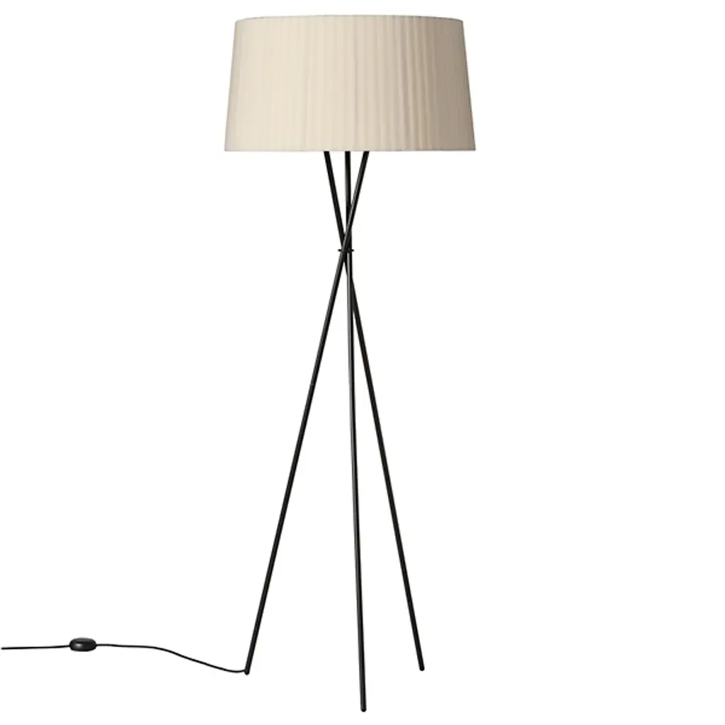 The Santa & Cole Tripode G5 Floor Lamp, is a contemporary beauty dressed in traditional clothes. As classic as the black cocktail dress, the Tripode G5 Floor Lamp, with the large, drum-shaped, cotton-ribbon lampshade, is no shrinking violet. Its presence can define a lost corner and give substance to interior decor. Designed in 1997.
