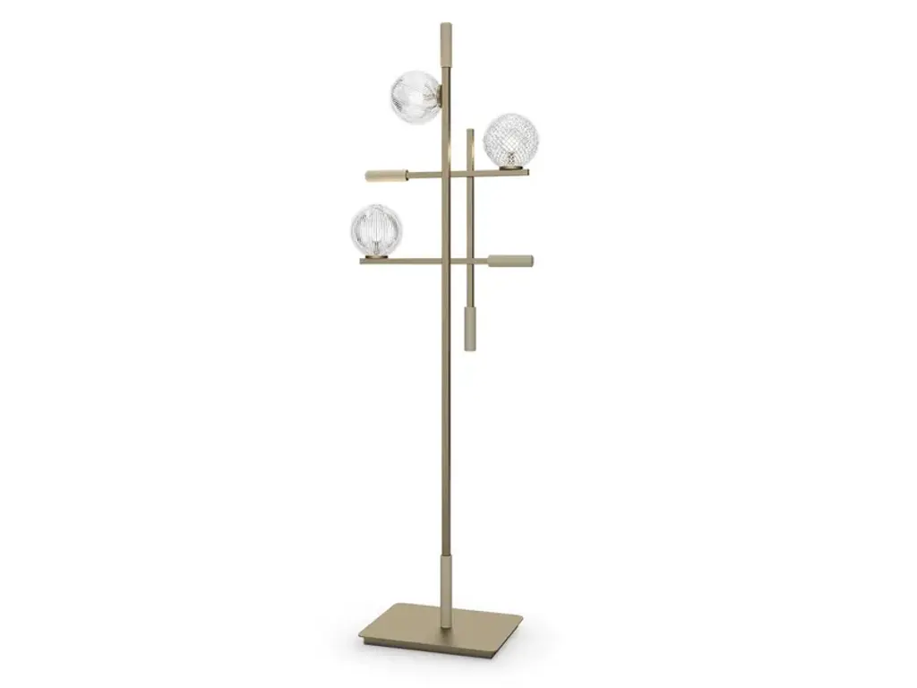 Tris is a metal table lamp in champagne finish. Murano glass spheres and decorative leather cylinders.The inspiration for this lamp came from a perfect information game that has surely occupied our fun moments at some point because...”Life is more fun when you play games” (cit.)