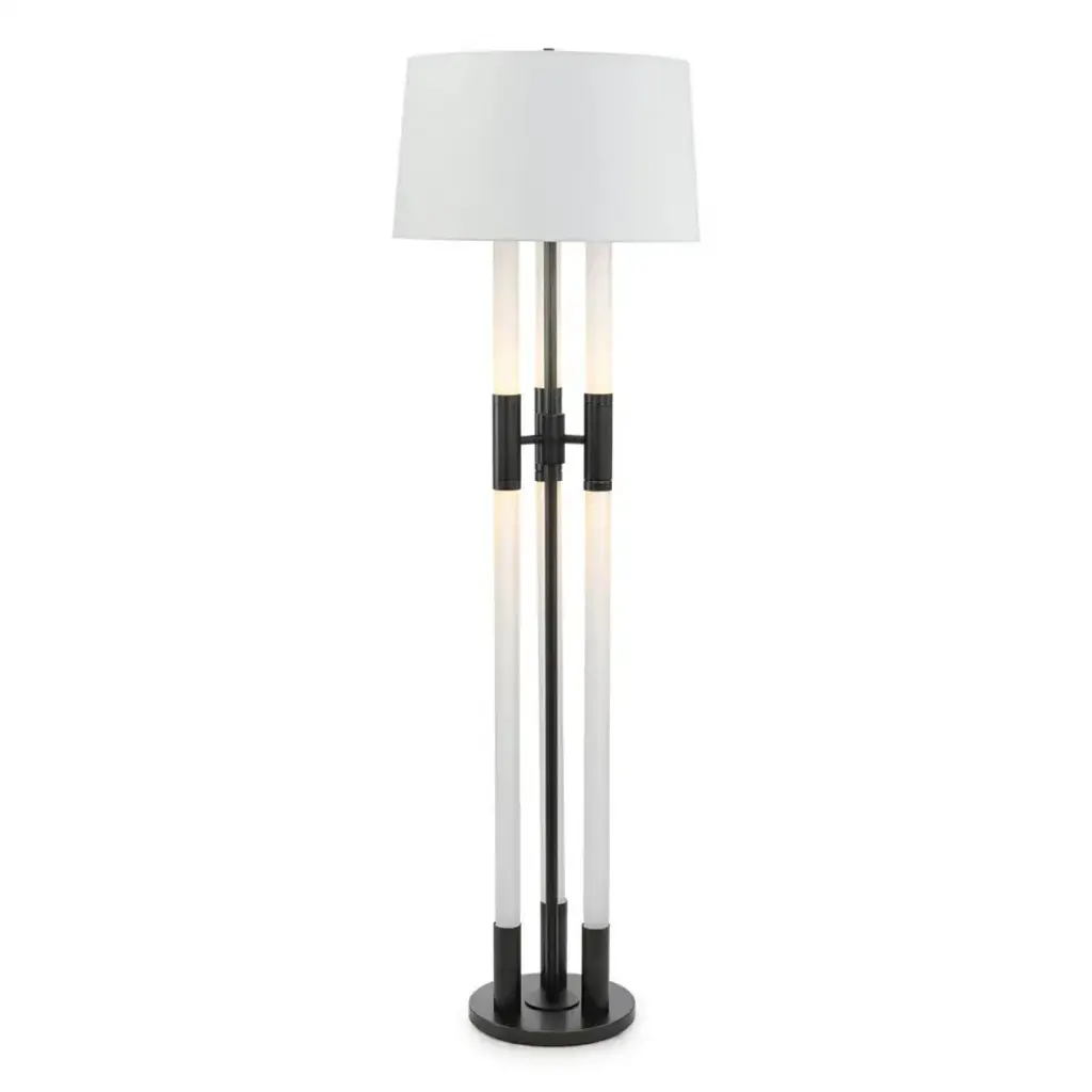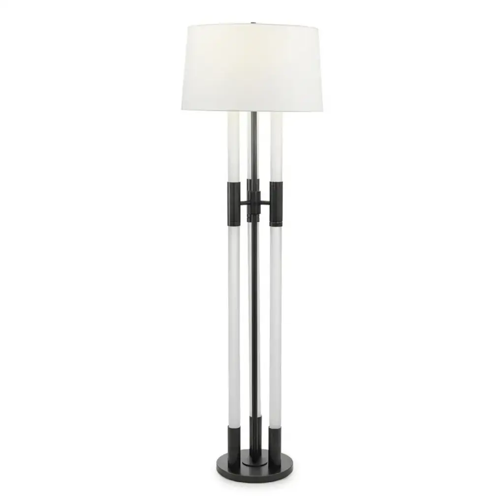 The Troika Floor Lamp is a dignified statement piece that exudes pristine contemporary charm. Three acrylic pillars feature metallic accents in a dark rubbed bronze finish, complemented by a matching round base. This three-way turnkey lamp displays a rounded puck finial, complementing the bronze accents to complete the look.