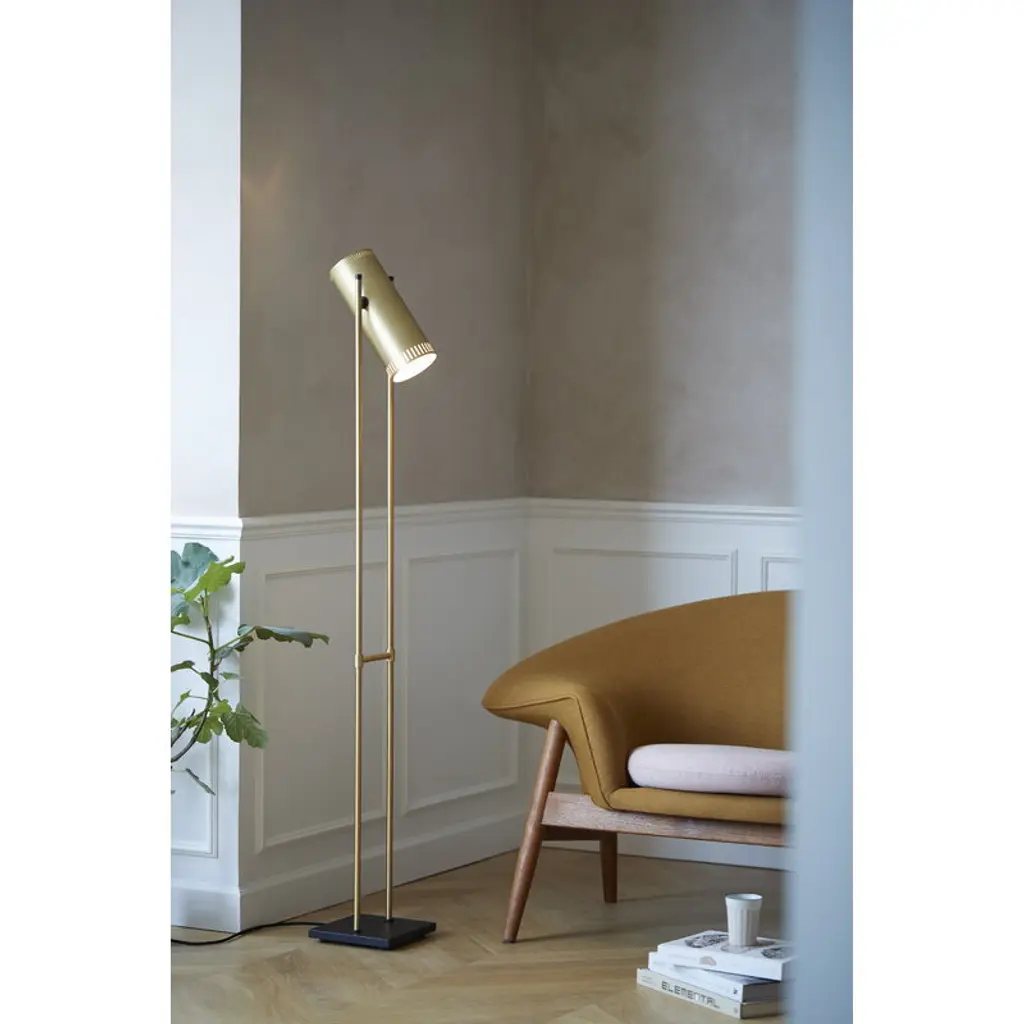 Warm Nordic’s Trombone floor lamp features a narrow, cylindrical metal shade with a white inner surface that reflects light from both ends of the shade. The edges are perforated with thin vertical slits, allowing light to shine through a beautiful way. The Trombone floor lamp stands on steel legs attached to a square-shaped base, and its shade can be tilted up and down. A combination of geometric expression and metallic surfaces, the Trombone collection is a masterpiece created by Danish lighting designer Jo Hammerborg in 1966. The collection’s graceful and simple esthetics still look modern and fresh, and the Trombone luminaires will easily find their place in any contemporary interior.