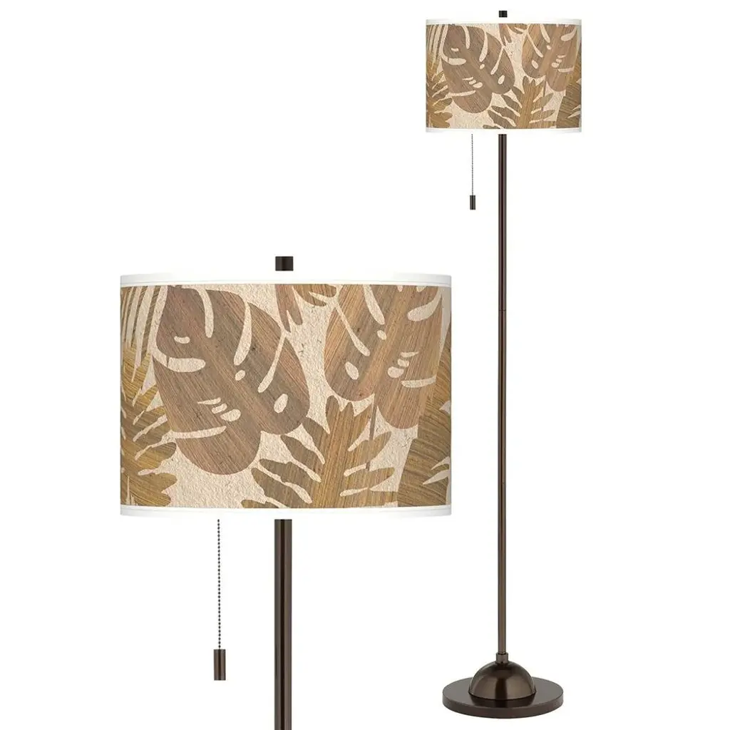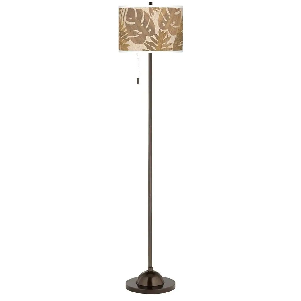 PRODUCT DETAILS: Overall: 62" high. Shade is 13 1/2" wide x 10" high. Base is 11" wide. Takes one maximum 100 watt bulb (not included). On/off pull chain. Club floor lamp with slim profile. Tiger bronze finish. Custom printed Tropical Woodwork pattern drum shade. DESCRIPTION: Add style to your favorite room with this club style floor lamp. The lamp comes in a tiger bronze finish and has a slim profile perfect for seating areas, bedrooms and more. Up top is a drum shade with a stylish Tropical Woodwork printed giclee pattern. An on/off pull chain hangs below the shade within easy reach. Custom made-to-order shade design.