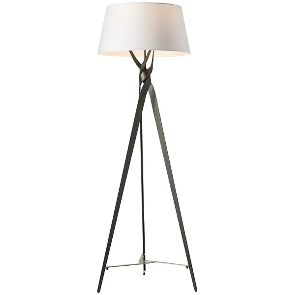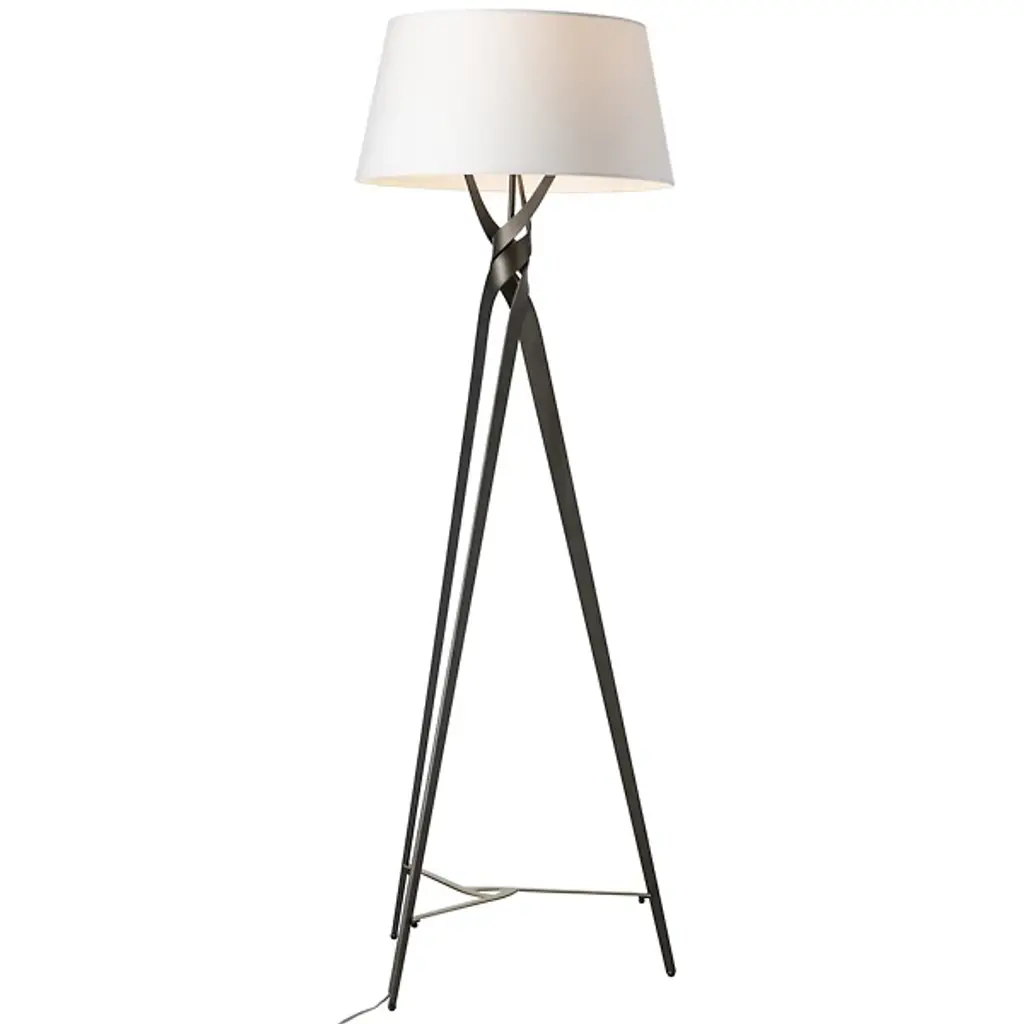 A tripod with a twist. The Tryst Floor Lamp by Hubbardton Forge offers a playful yet sophisticated take on the classic mid-century modern tripod floor lamp with hand-forged steel legs that culminate at the top in an eye-catching tangle. A flared drum fabric shade provides a refined finishing touch and allows, in addition to ample ambience, plentiful downlight to highlight both the base’s intricate twist and the accenting leg support near the bottom.