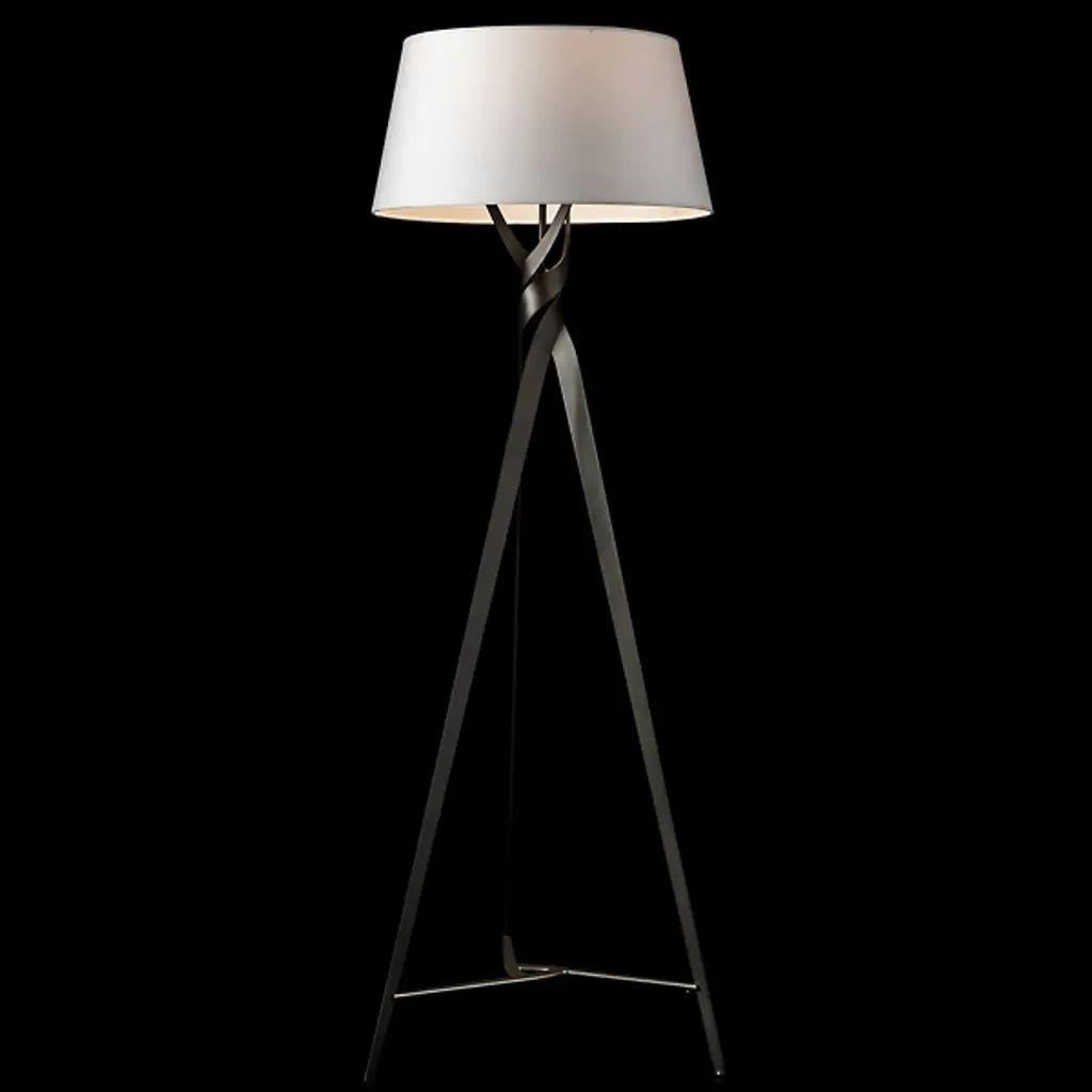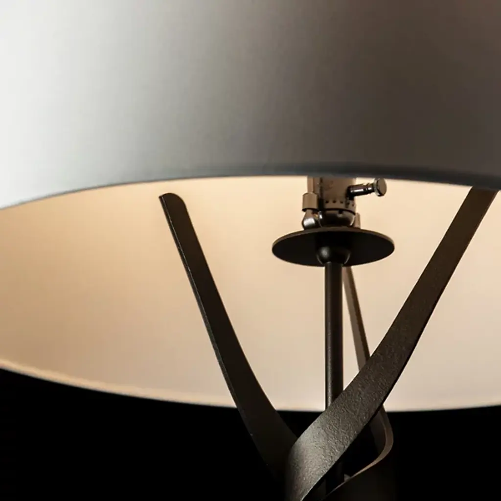A tripod with a twist. The Tryst Floor Lamp by Hubbardton Forge offers a playful yet sophisticated take on the classic mid-century modern tripod floor lamp with hand-forged steel legs that culminate at the top in an eye-catching tangle. A flared drum fabric shade provides a refined finishing touch and allows, in addition to ample ambience, plentiful downlight to highlight both the base’s intricate twist and the accenting leg support near the bottom.