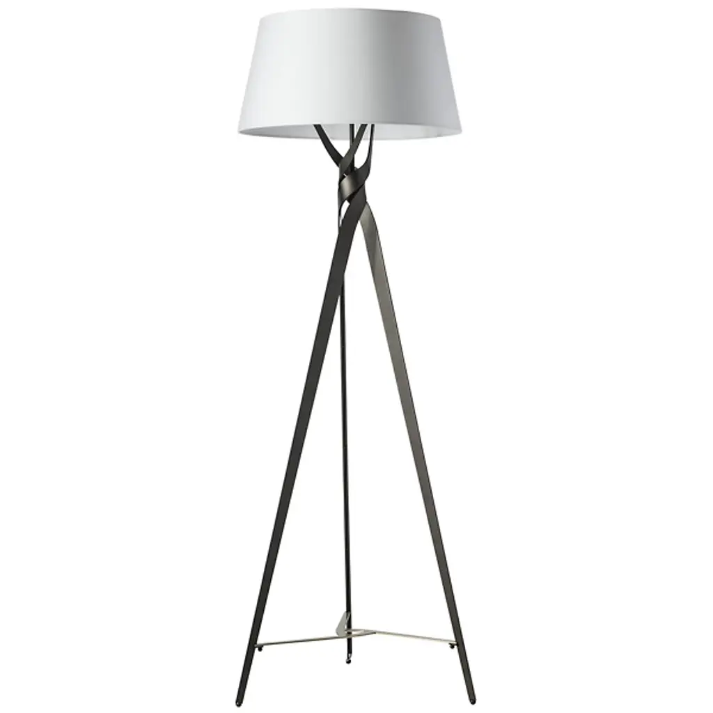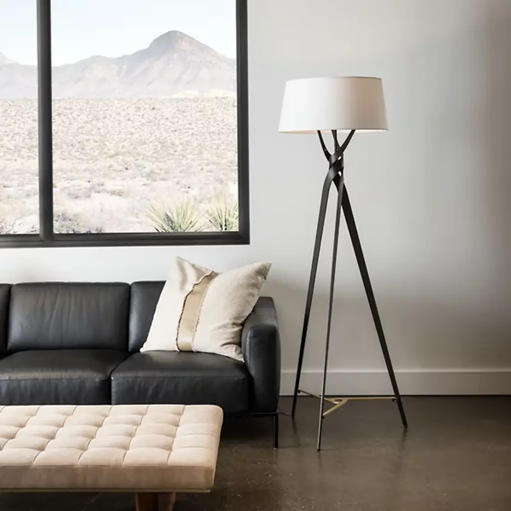 A tripod with a twist. The Tryst Floor Lamp by Hubbardton Forge offers a playful yet sophisticated take on the classic mid-century modern tripod floor lamp with hand-forged steel legs that culminate at the top in an eye-catching tangle. A flared drum fabric shade provides a refined finishing touch and allows, in addition to ample ambience, plentiful downlight to highlight both the base’s intricate twist and the accenting leg support near the bottom.