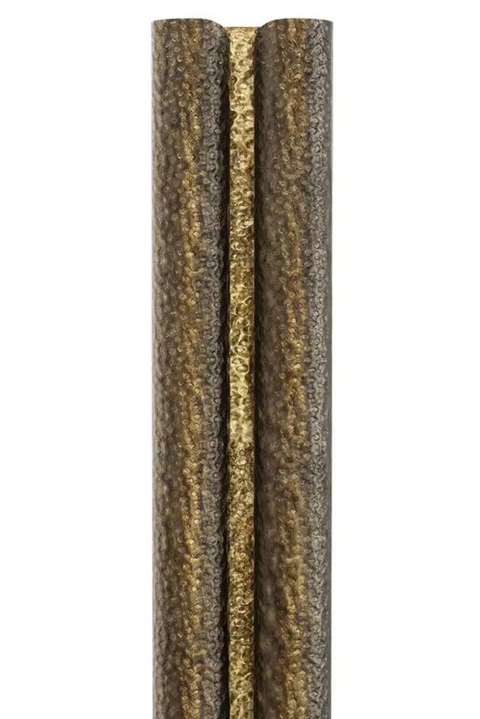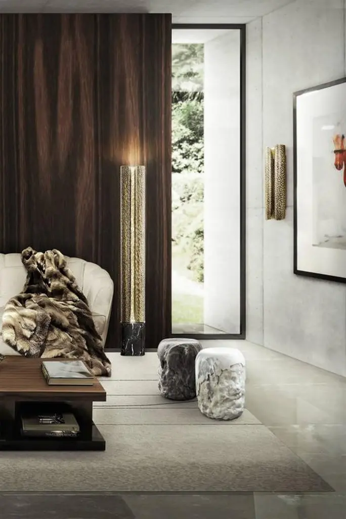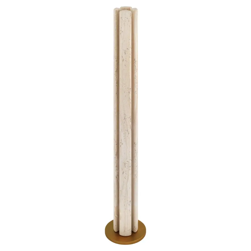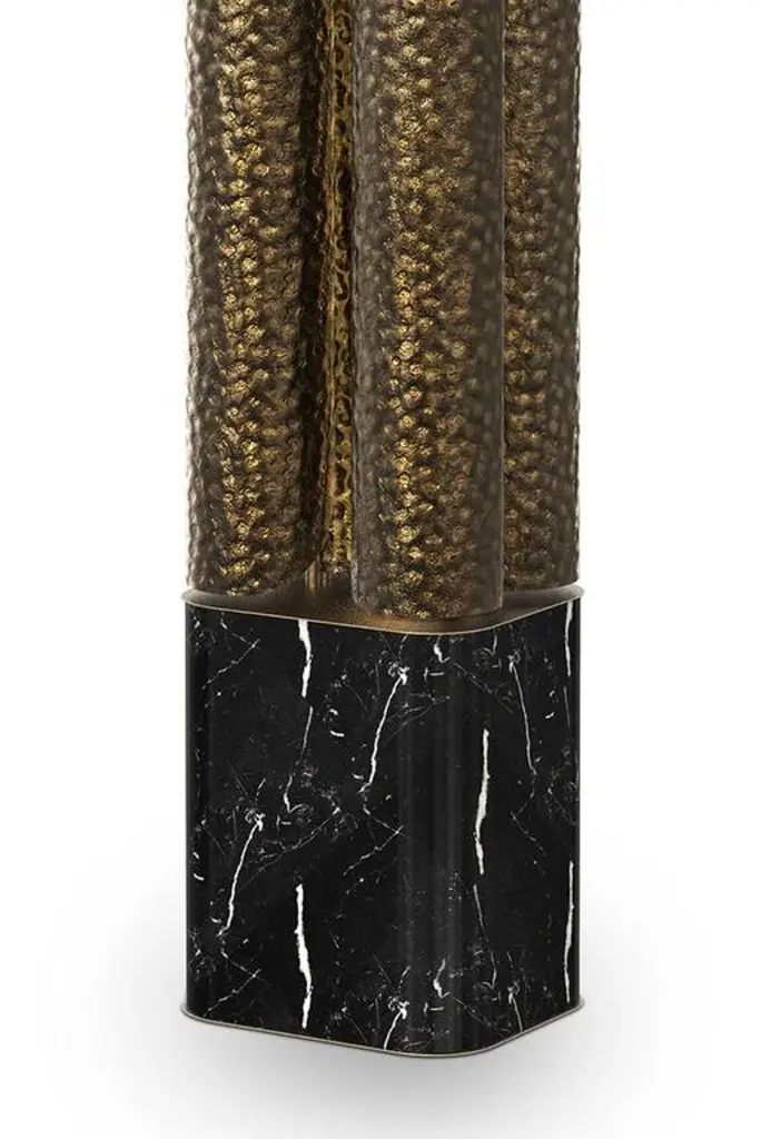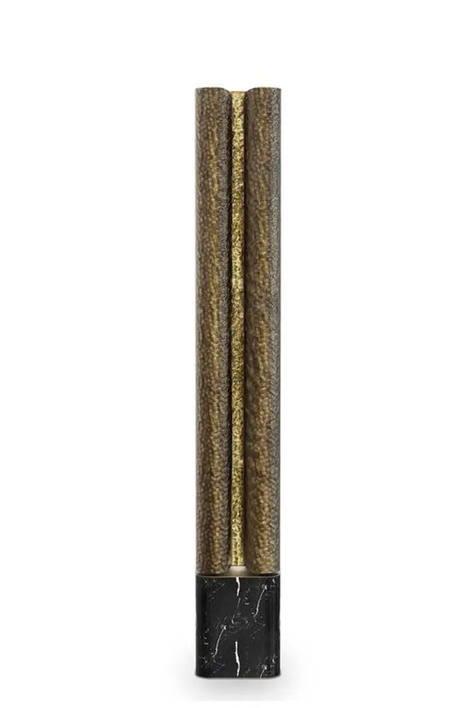 Floor lamp Tuba with handcrafted hammered agedbrush brass. Polished brass inside. Base in Nero Marquina marble.