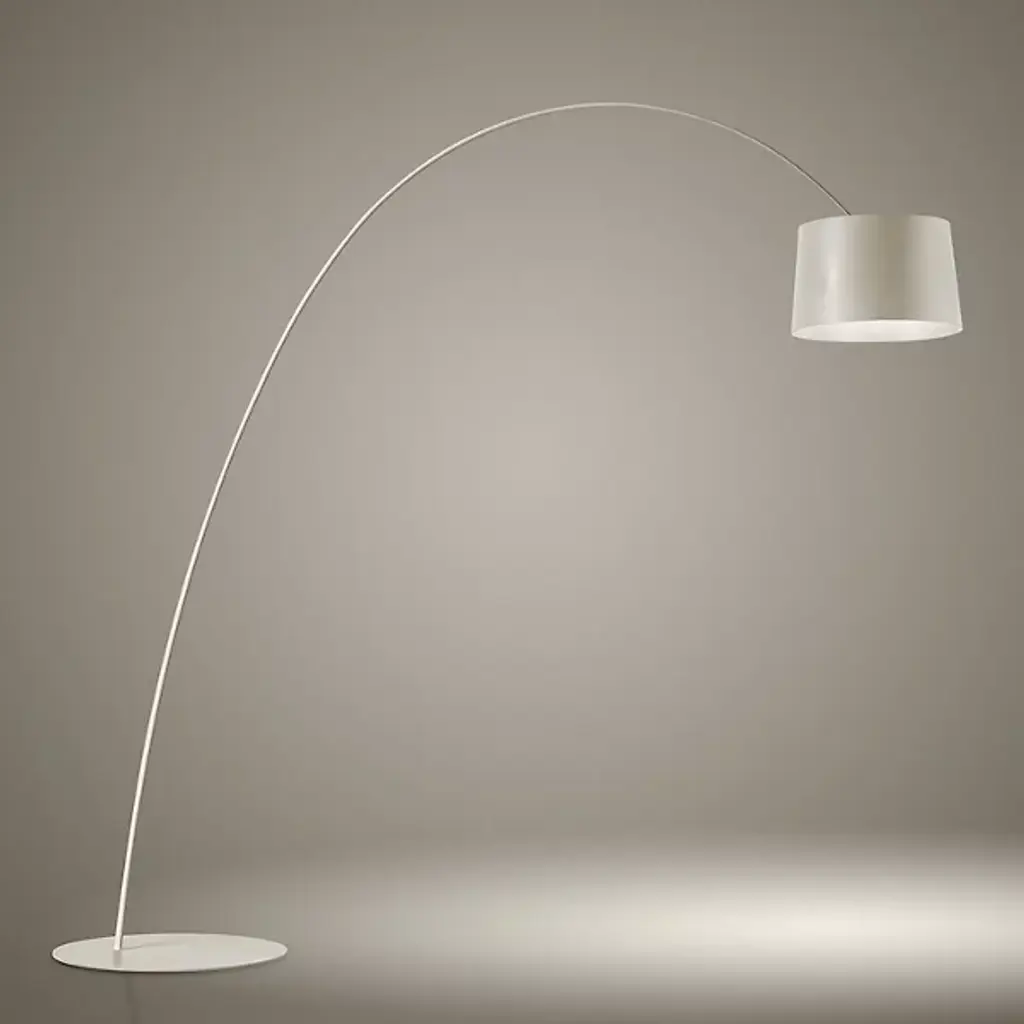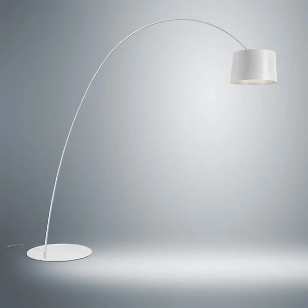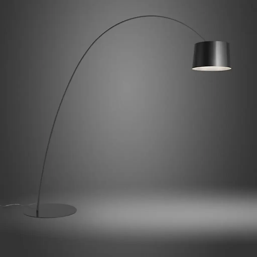 A piece that started as a ‘ridiculous’ idea. A functional modern piece today, the Italian-made Twiggy Elle LED Arc Floor Lamp from Foscarini finds its origins in designer Marc Sadler’s mind as a mannequin holding a fishing rod. Sadler’s passion for art and intellectual curiosity makes for personality-filled designs. Sadler refines the visual of a fishing-rod holding man with a minimalist silhouette. Made from a strong, flexible synthetic fiber, the floor lamp’s stem creates a visual line that hugs a room. This sweeping curve holds its place with a solid and charming circular metal base. Peeking at the end with a curious look, a lacquered fiberglass shade tucks the bulbs inside its deep drum form. Turn it on and receive a blanket of clean downlight together with a soft ambient glow.