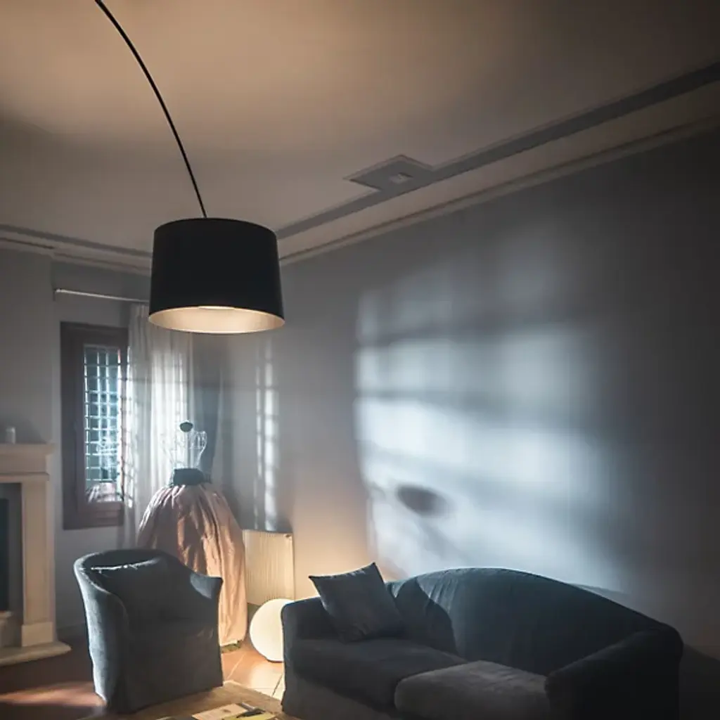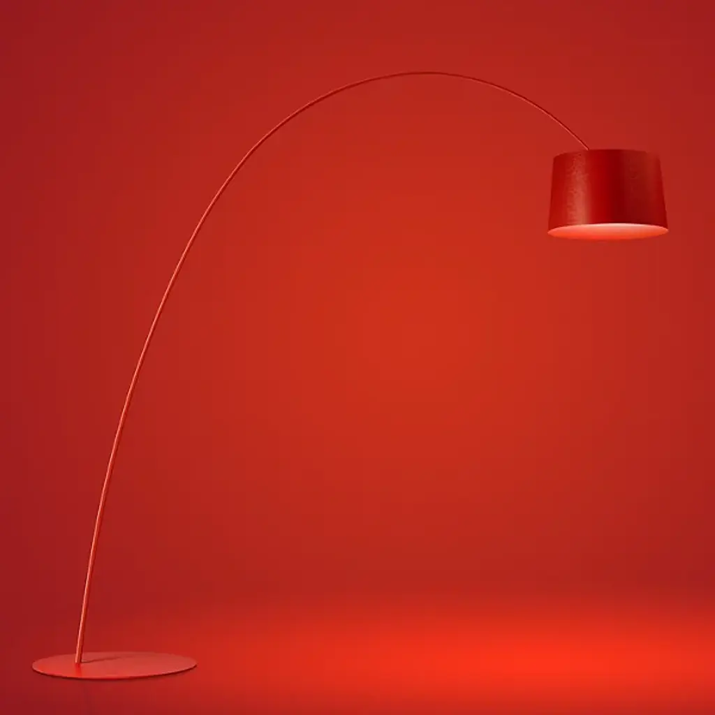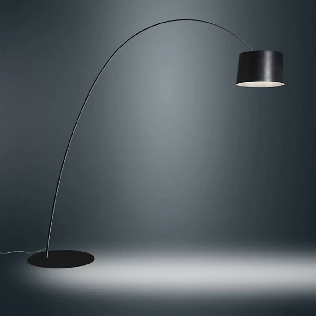 A piece that started as a ‘ridiculous’ idea. A functional modern piece today, the Italian-made Twiggy Elle LED Arc Floor Lamp from Foscarini finds its origins in designer Marc Sadler’s mind as a mannequin holding a fishing rod. Sadler’s passion for art and intellectual curiosity makes for personality-filled designs. Sadler refines the visual of a fishing-rod holding man with a minimalist silhouette. Made from a strong, flexible synthetic fiber, the floor lamp’s stem creates a visual line that hugs a room. This sweeping curve holds its place with a solid and charming circular metal base. Peeking at the end with a curious look, a lacquered fiberglass shade tucks the bulbs inside its deep drum form. Turn it on and receive a blanket of clean downlight together with a soft ambient glow.