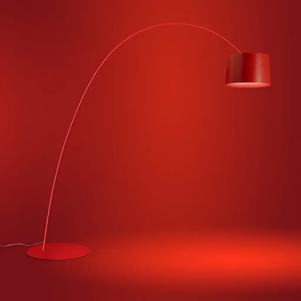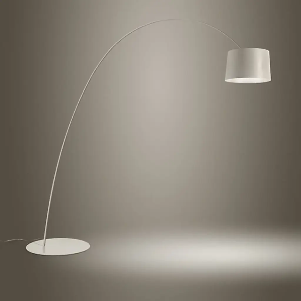 A piece that started as a ‘ridiculous’ idea. A functional modern piece today, the Italian-made Twiggy Elle LED Arc Floor Lamp from Foscarini finds its origins in designer Marc Sadler’s mind as a mannequin holding a fishing rod. Sadler’s passion for art and intellectual curiosity makes for personality-filled designs. Sadler refines the visual of a fishing-rod holding man with a minimalist silhouette. Made from a strong, flexible synthetic fiber, the floor lamp’s stem creates a visual line that hugs a room. This sweeping curve holds its place with a solid and charming circular metal base. Peeking at the end with a curious look, a lacquered fiberglass shade tucks the bulbs inside its deep drum form. Turn it on and receive a blanket of clean downlight together with a soft ambient glow.