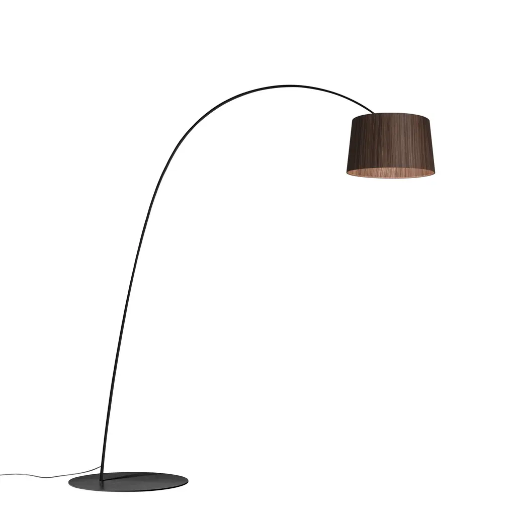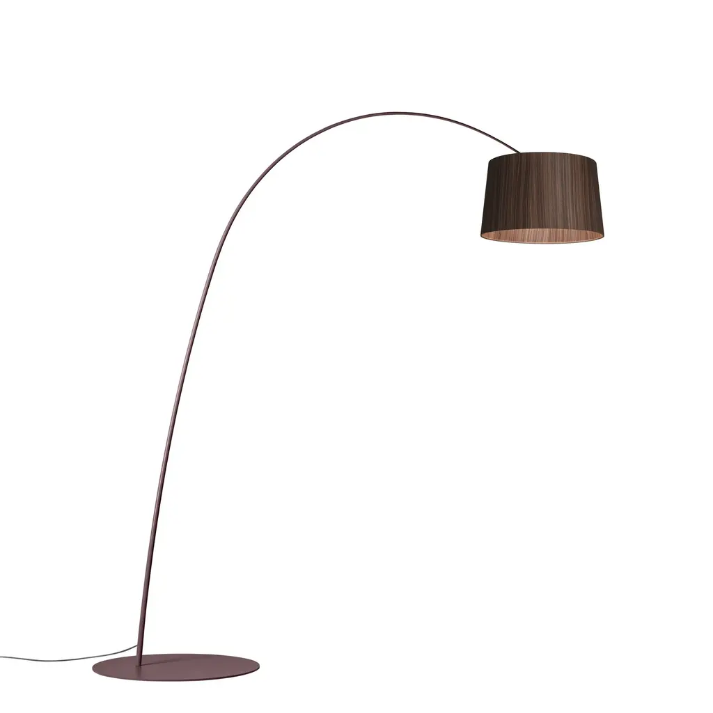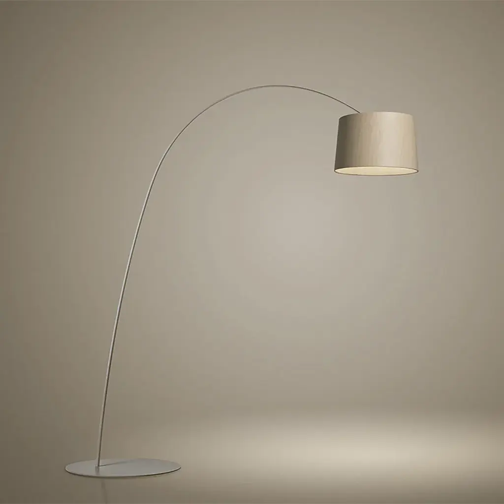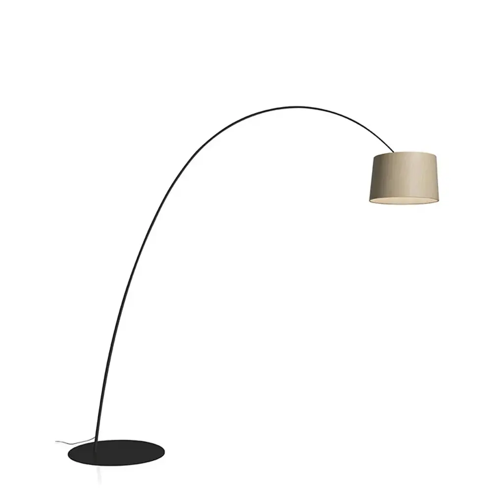 Floor lamp with direct and indirect light. The diffuser is obtained from the overlapping of two sheets of limed maple wood. To guarantee the circumference, both the top and bottom of the diffuser have been fitted with a bamboo ring measuring a few millimeters in thickness. The rod is made of fibreglass-based composite material and liquid coated. Epoxy powder coated metal round base. Supplied with 4 counter-weights to be inserted in the purpose-provided seat above the diffuser to adjust its height. Additional arc-extending rods available upon request. The transparent cable is fitted with a dimmer which can be used both to adjust the level of luminous intensity gradually or as the on/off switch. Features