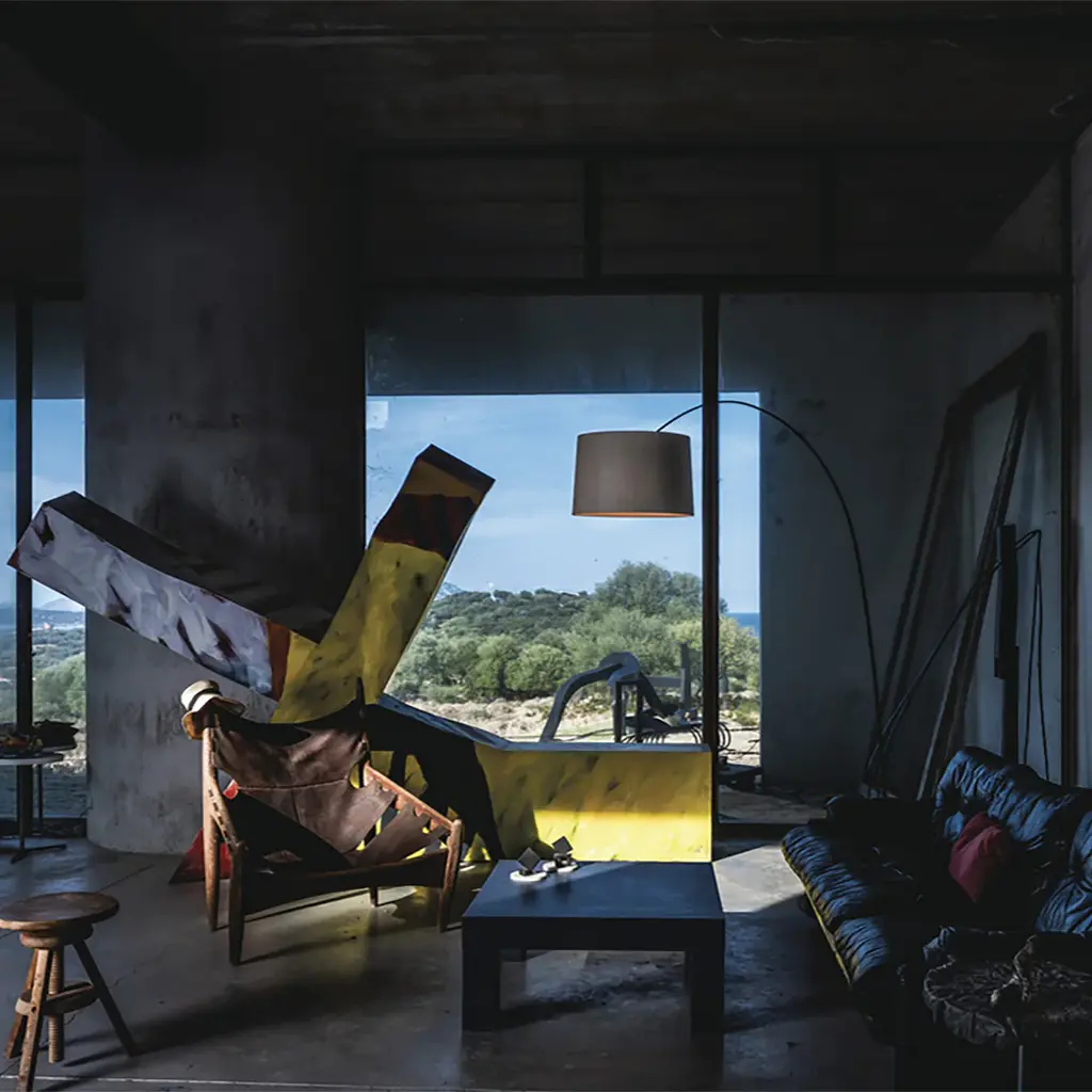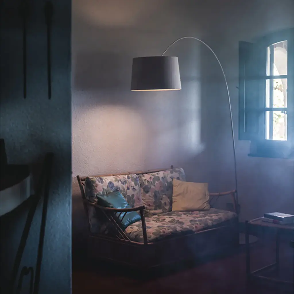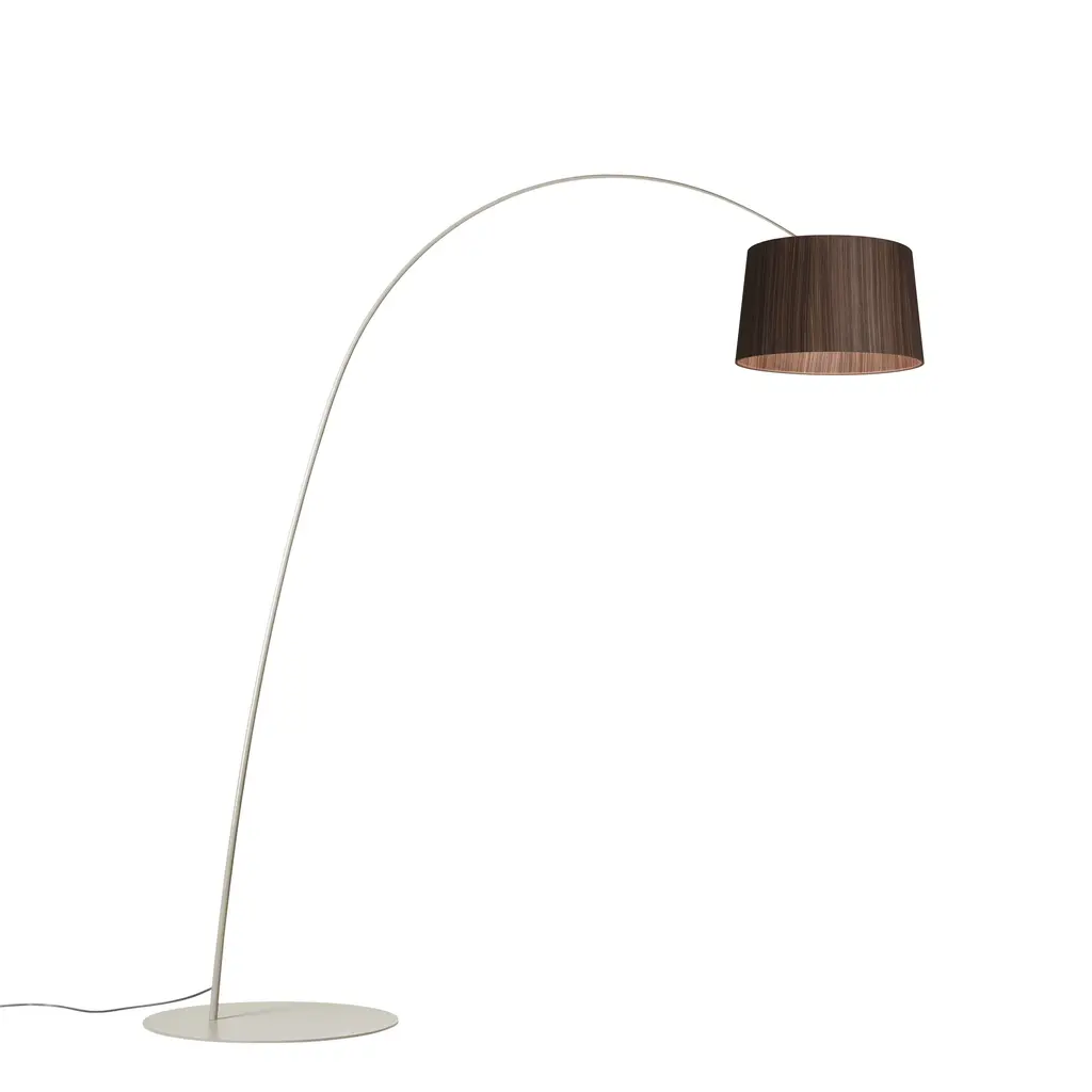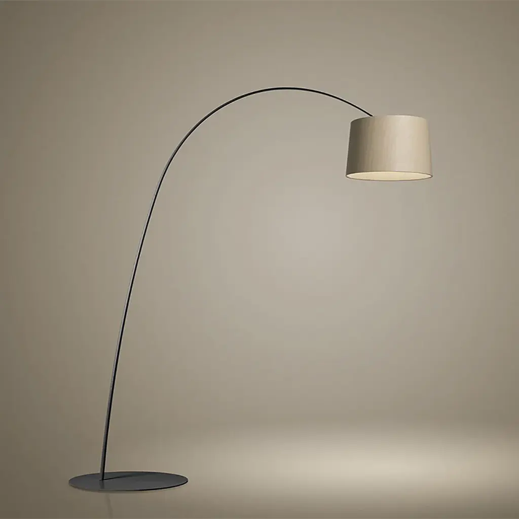 Floor lamp with direct and indirect light. The diffuser is obtained from the overlapping of two sheets of limed maple wood. To guarantee the circumference, both the top and bottom of the diffuser have been fitted with a bamboo ring measuring a few millimeters in thickness. The rod is made of fibreglass-based composite material and liquid coated. Epoxy powder coated metal round base. Supplied with 4 counter-weights to be inserted in the purpose-provided seat above the diffuser to adjust its height. Additional arc-extending rods available upon request. The transparent cable is fitted with a dimmer which can be used both to adjust the level of luminous intensity gradually or as the on/off switch. Features