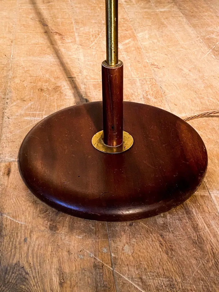 Pair of elegant floor lamps with a twist. Slender brass shafts with stylized teak flicker candle twists over round teak bases. France, 1970s.