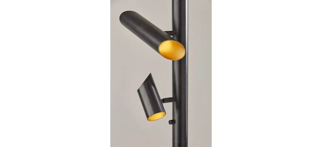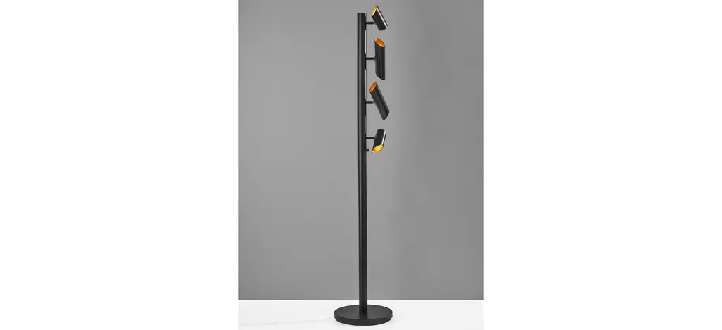 An edgy accent to any room, the Tyler LED Floor Lamp is the perfect choice to upgrade your contemporary style. Four black cylinder shades with slanted edges have LED's on both ends for double the amount of light! With a wide range of lamp shade adjustability and a full range dimmer switch, this lamp can provide anything from bright ambient lighting to light up an intire room to dim directive lighting for night time reading. The Tyler LED Floor Lamp also has a 2" thick pole and a 14" base, making this design a substantial, statement making piece of home decor.