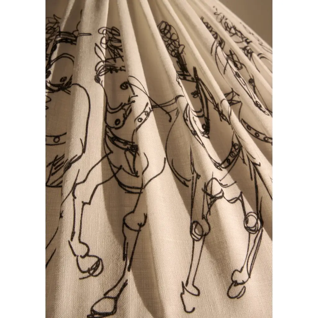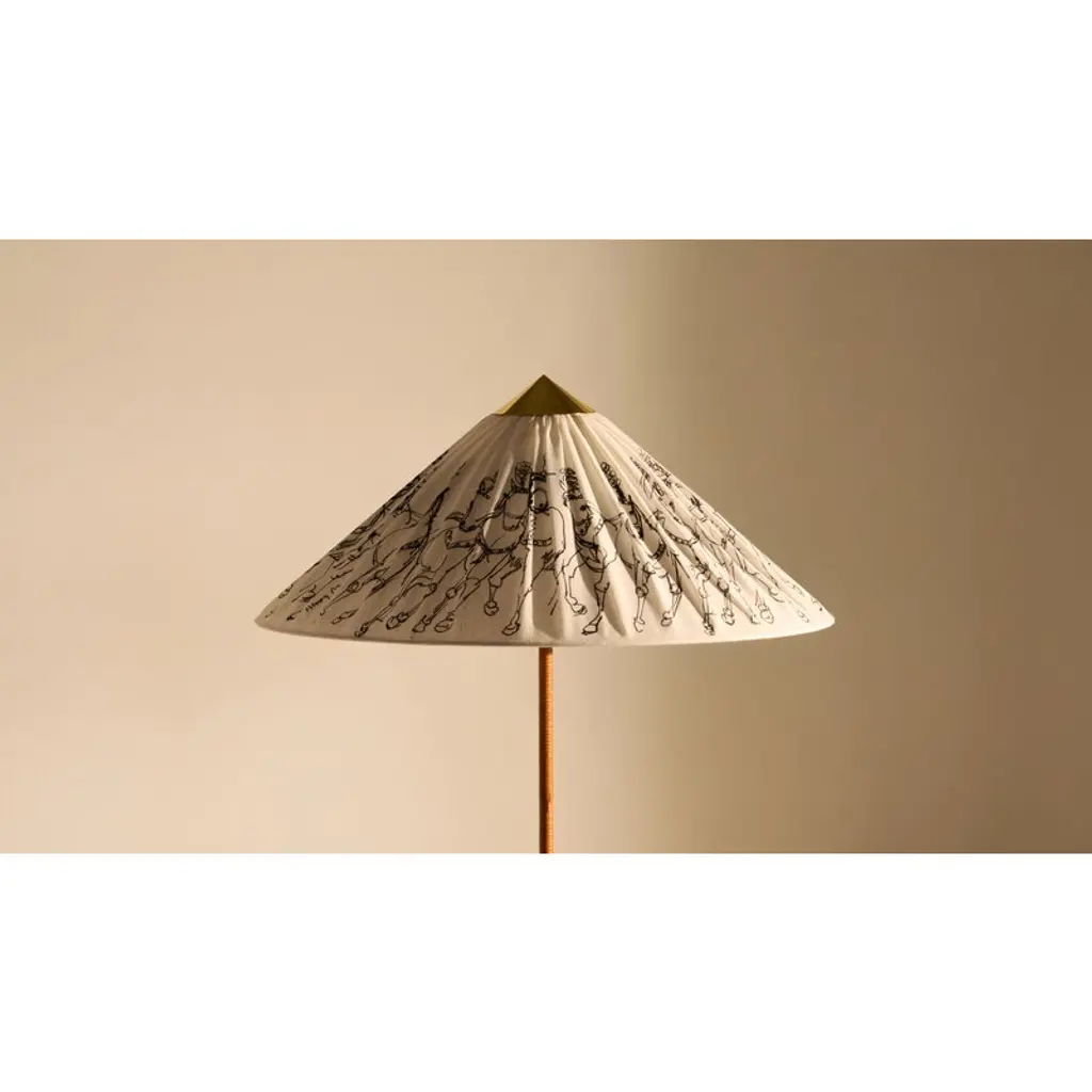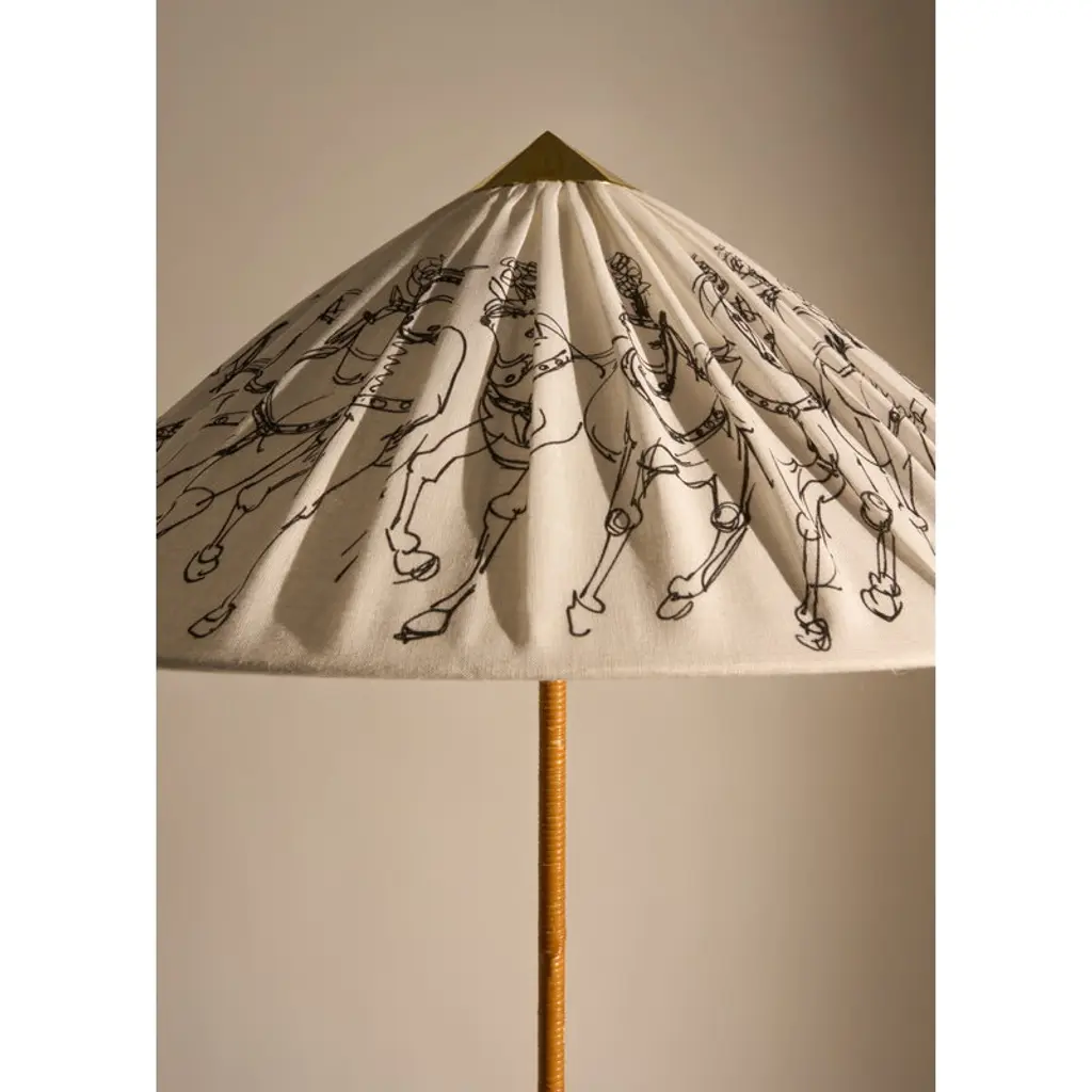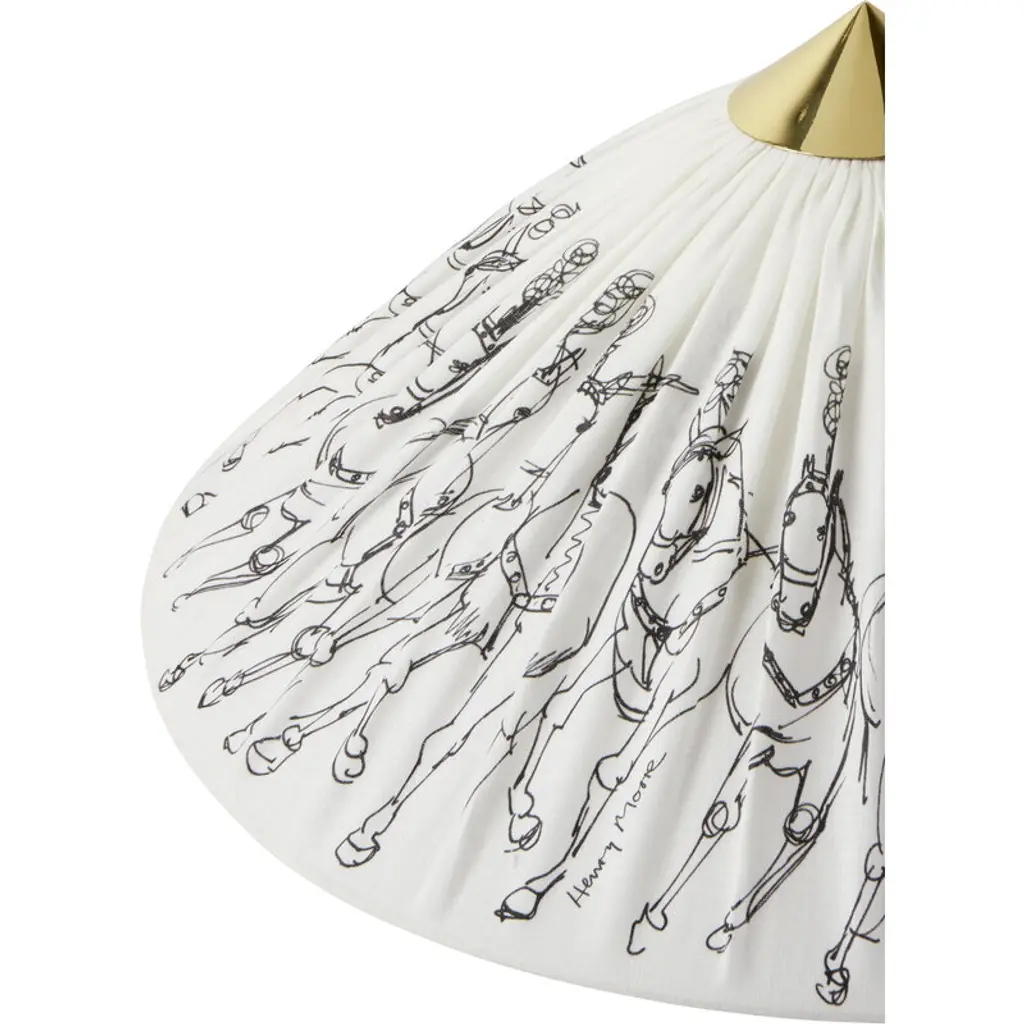 GUBI’s Tynell 9602 floor lamp was created by Finnish lighting designer Paavo Tynell, who designed this delicate masterpiece back in 1935 for the Hotel Aulanko in Hämeenlinna. The 9602 lamp, also known as the Chinese Hat, features a wide, conical canvas shade inspired by traditional Asian sun hats, and a slender rattan-covered stem, elegantly complemented by brass accents on the base as well as on top of the lampshade. The 9602 lamp exudes a gentle and invitingly warm light, showcasing Tynell’s remarkable ability to play with the artistic dimensions of light and balance various elements harmoniously. Originally produced by the Finnish company Oy Taito Ab, the luminaire is now part of the Paavo Tynell collection under the Danish design brand GUBI. The linen fabric of the lampshade has been produced in collaboration with the French textile brand Garro Éditions. The elegant look features Henry Moore's delicate illustrations of circus horses drawn in black lines, waiting to take to the stage.