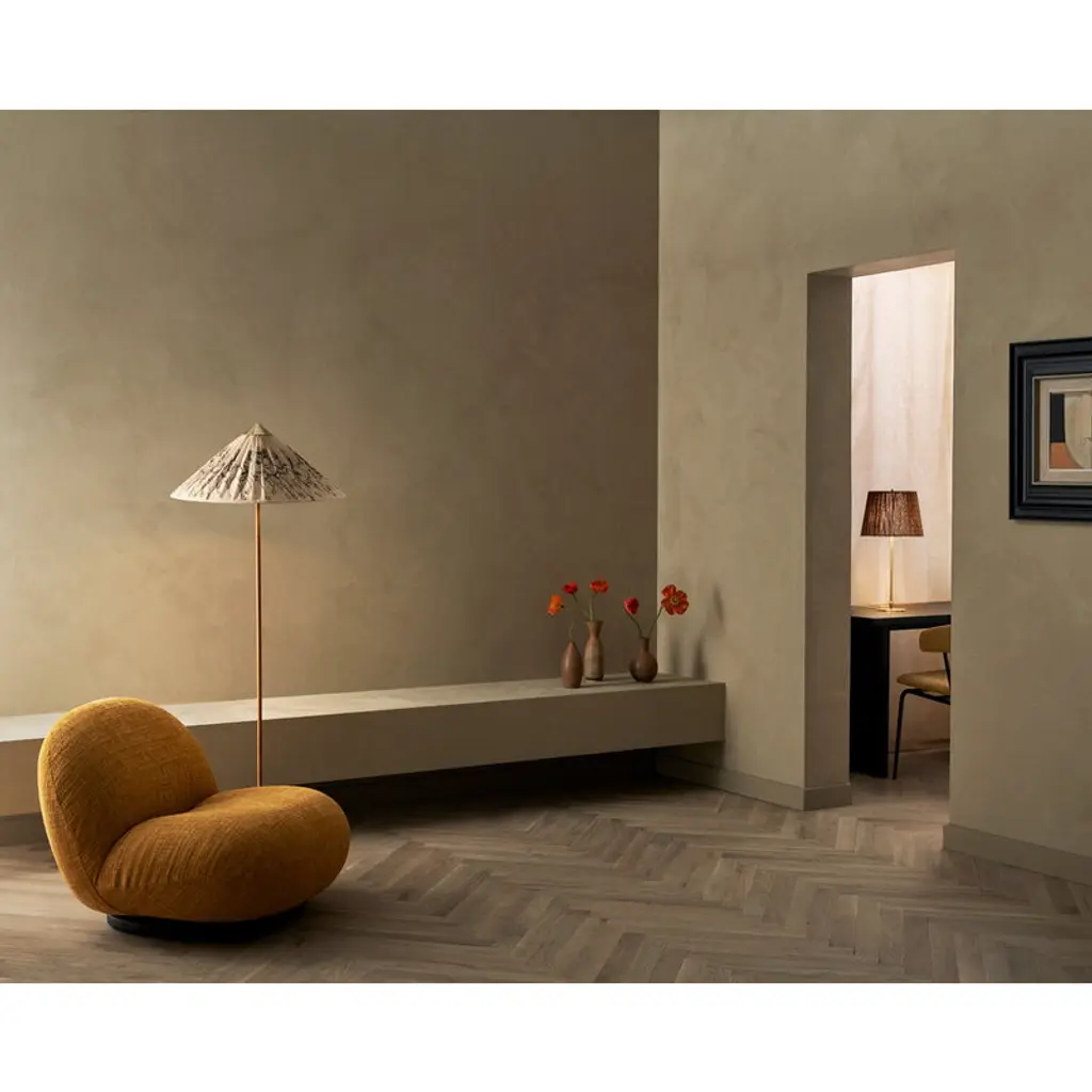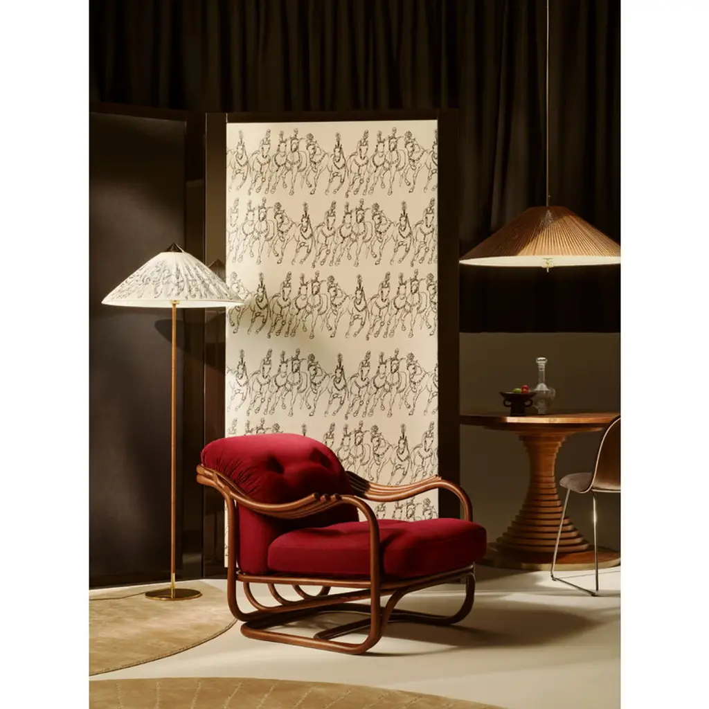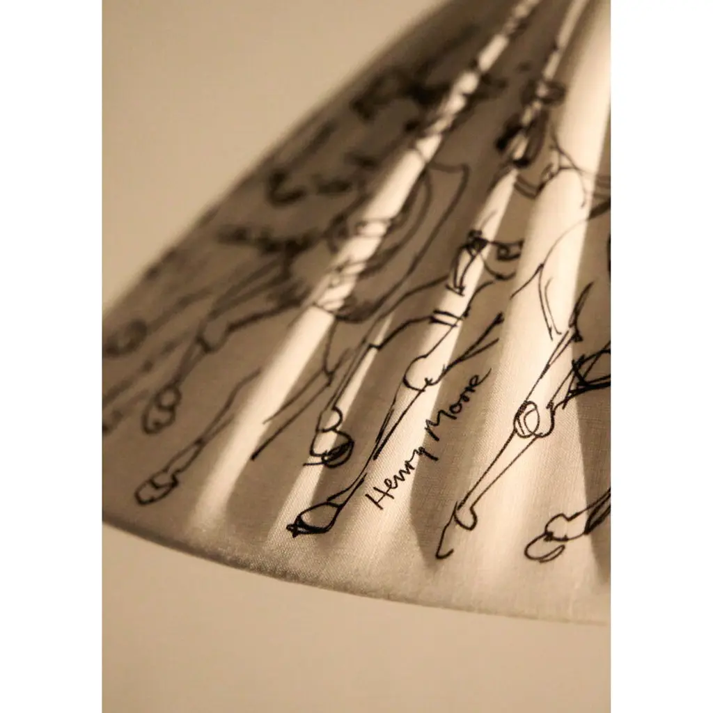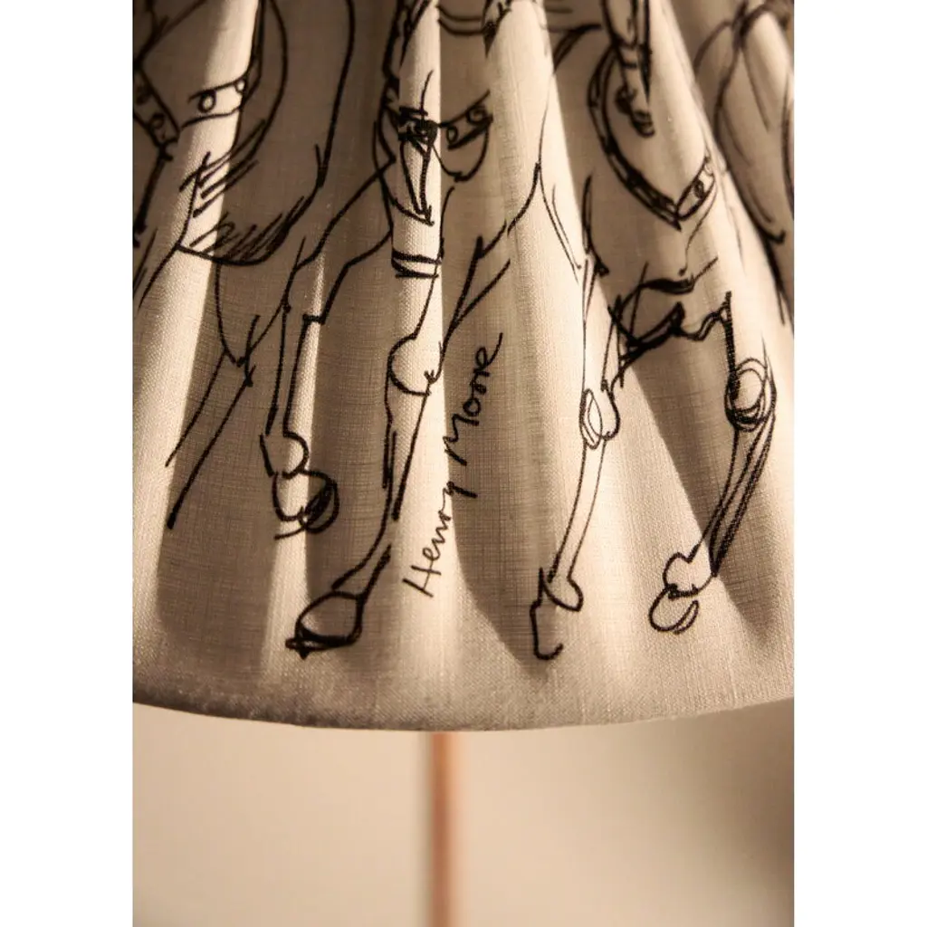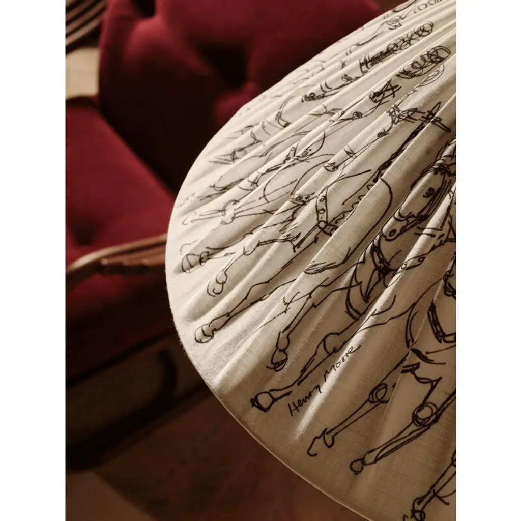 GUBI’s Tynell 9602 floor lamp was created by Finnish lighting designer Paavo Tynell, who designed this delicate masterpiece back in 1935 for the Hotel Aulanko in Hämeenlinna. The 9602 lamp, also known as the Chinese Hat, features a wide, conical canvas shade inspired by traditional Asian sun hats, and a slender rattan-covered stem, elegantly complemented by brass accents on the base as well as on top of the lampshade. The 9602 lamp exudes a gentle and invitingly warm light, showcasing Tynell’s remarkable ability to play with the artistic dimensions of light and balance various elements harmoniously. Originally produced by the Finnish company Oy Taito Ab, the luminaire is now part of the Paavo Tynell collection under the Danish design brand GUBI. The linen fabric of the lampshade has been produced in collaboration with the French textile brand Garro Éditions. The elegant look features Henry Moore's delicate illustrations of circus horses drawn in black lines, waiting to take to the stage.