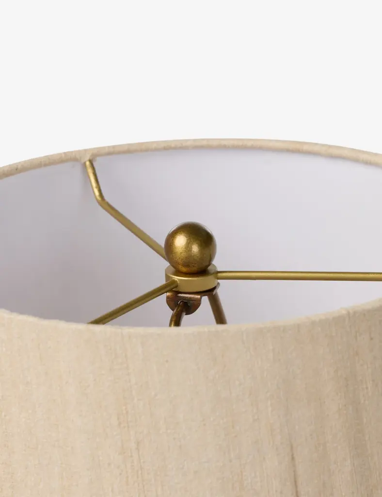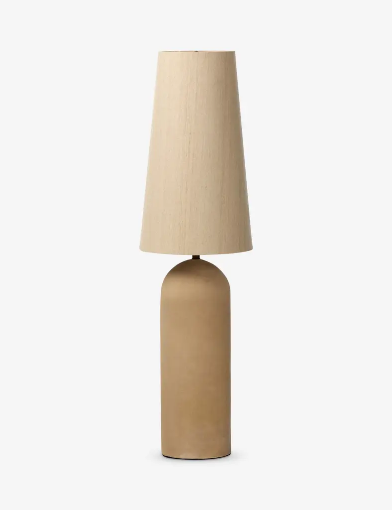 The Umberto lamp strikes a balance of softness and bold form. A tall ceramic base supports the scalloped shade, bringing contrast with fluid lines. Anchor this floor lamp in a corner or next to a sofa for a grounding touch with sculptural impact.