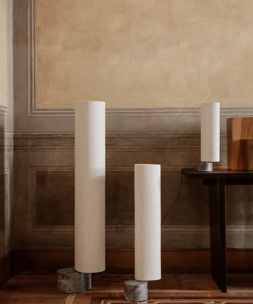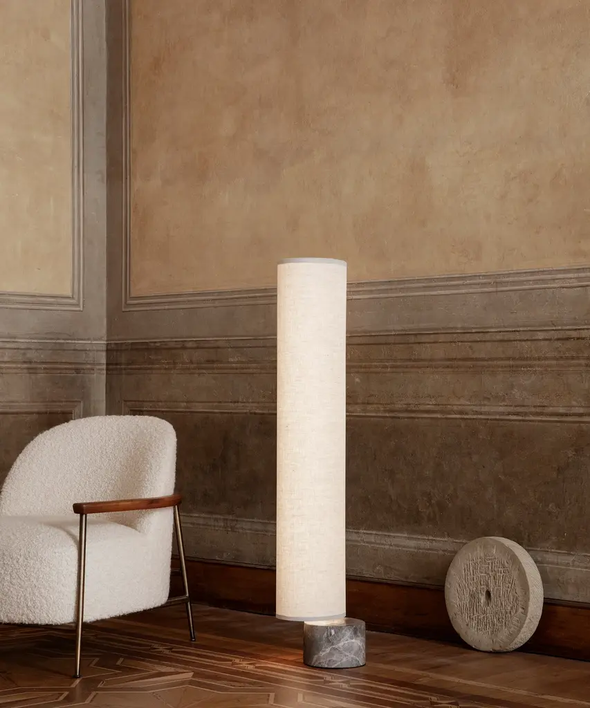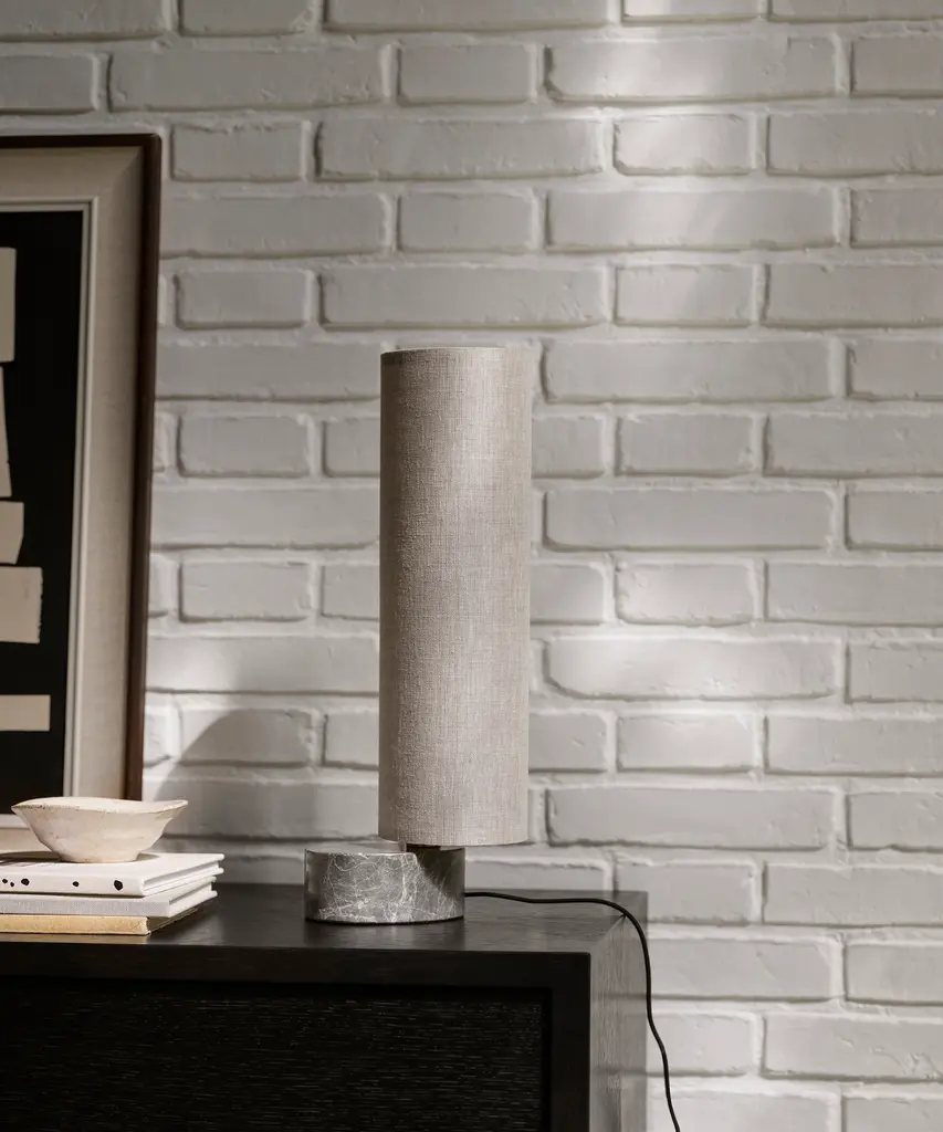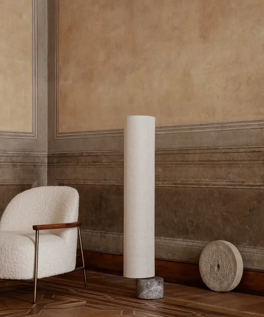 With the teardrop-shaped marble base acting as an anchor, the white linen or natural canvas shade can be effortlessly rotated around it, as though it were a sail, gently billowing. Its dark antique brass ‘mast’ supports an array of dimmable LED lights within the shade that create a soft, diffuse and evenly distributed light. Designed by Space Copenhagen for Danish design purveyor, Gubi.