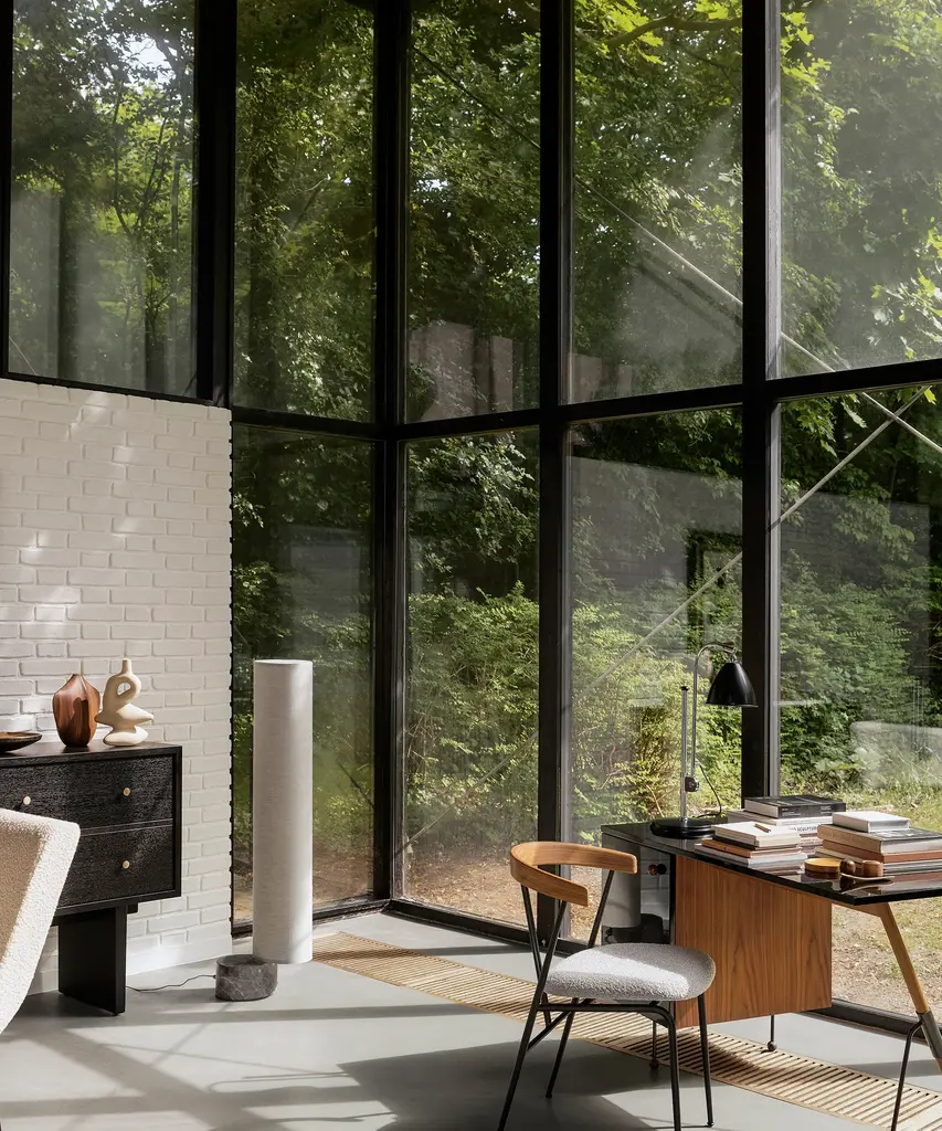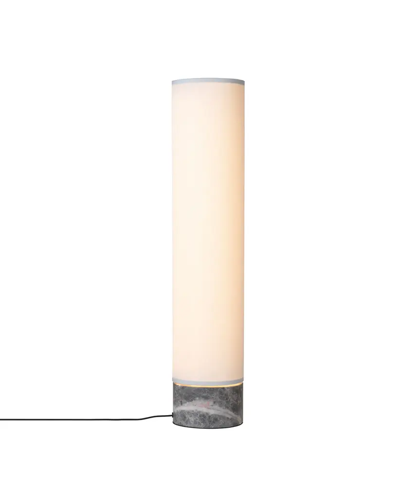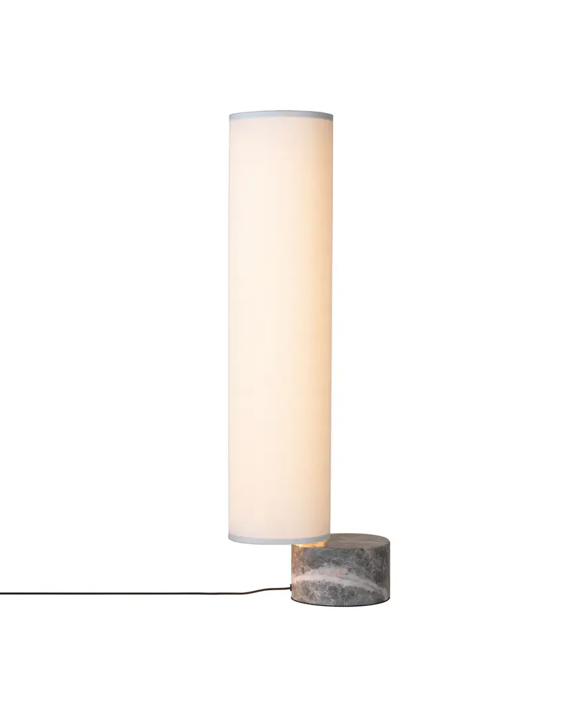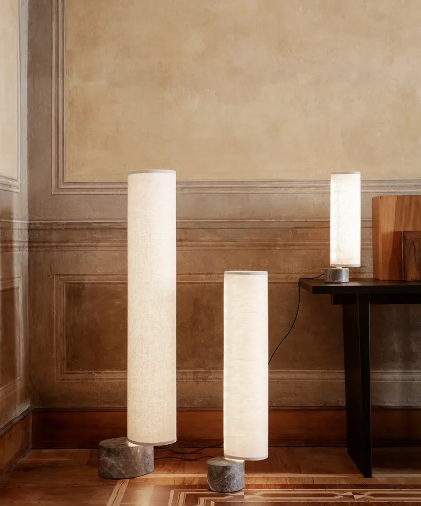 With the teardrop-shaped marble base acting as an anchor, the white linen or natural canvas shade can be effortlessly rotated around it, as though it were a sail, gently billowing. Its dark antique brass ‘mast’ supports an array of dimmable LED lights within the shade that create a soft, diffuse and evenly distributed light. Designed by Space Copenhagen for Danish design purveyor, Gubi.