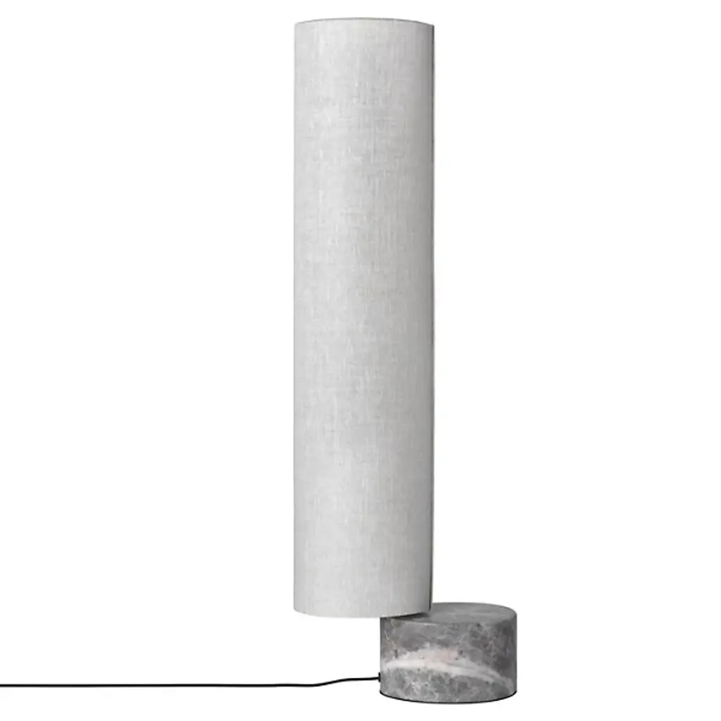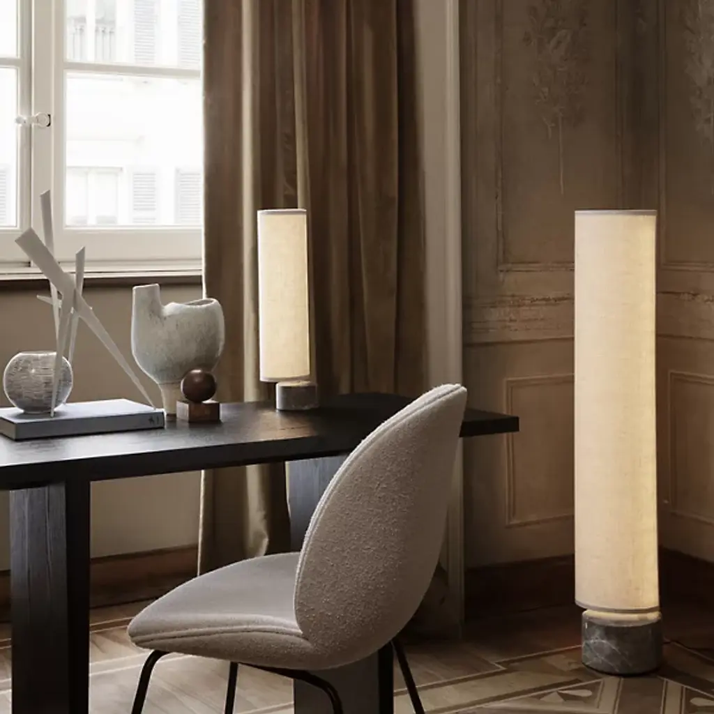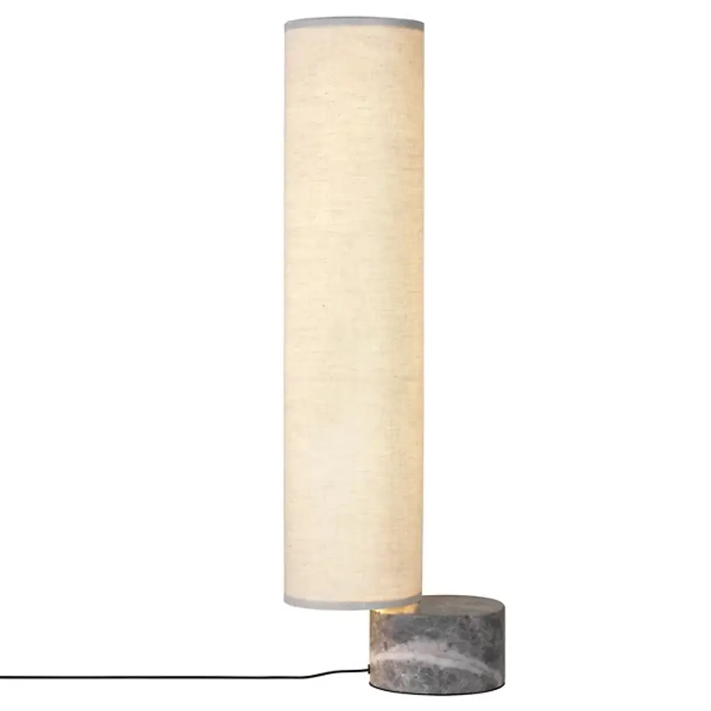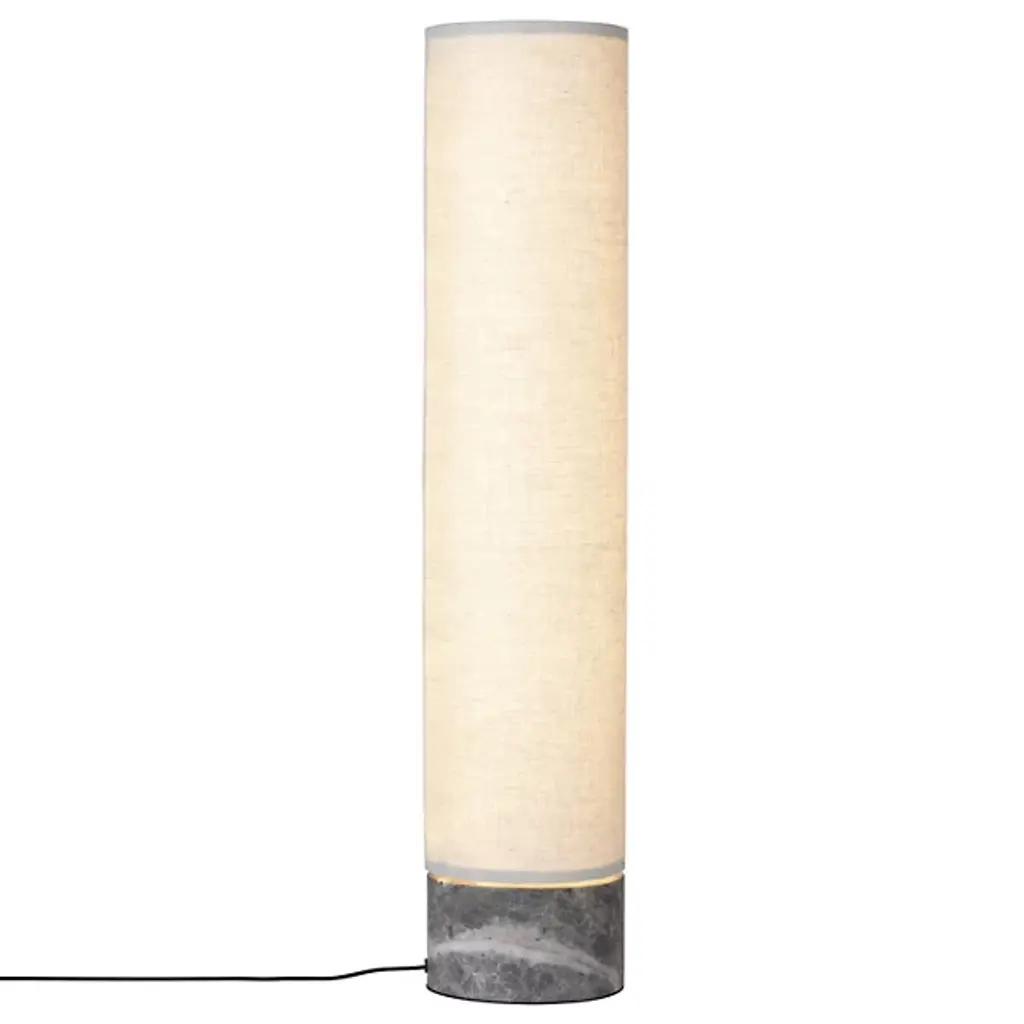 Inspired by Japanese lanterns, the Unbound LED Floor Lamp from Gubi presents sophisticated materials in a playful composition. Creator Space Copenhagen brings a poetic modernism approach to the piece, one calling for the balancing of opposites. The floor lamp shows this opposites-attract approach by contrasting the base's texture-rich marble to the uniform textile shade. A 360-degree adjustable mechanism between the base and shade enhances the contrasting shapes with a perched, asymmetrical silhouette. The cylindrical shade transforms into a tower of ambiance that leaves a warm glaze on the marble's artful surface below.