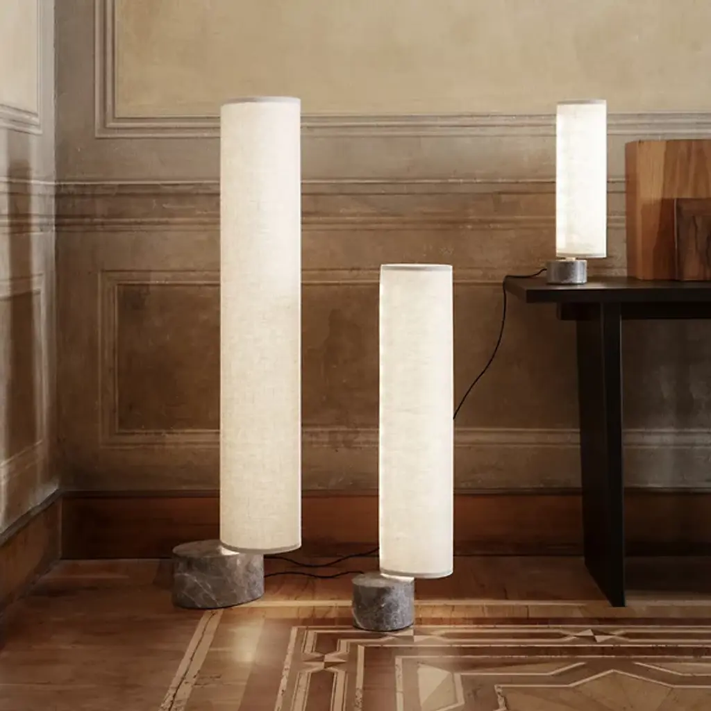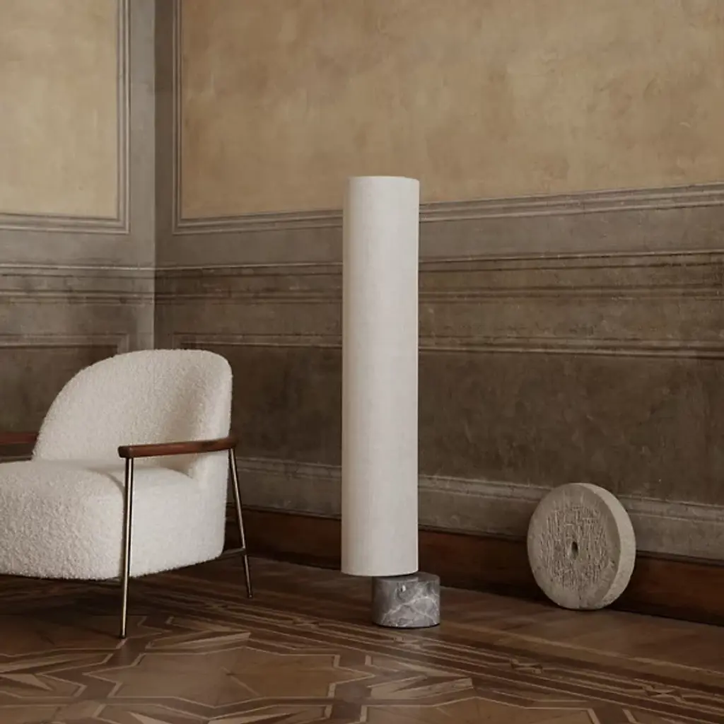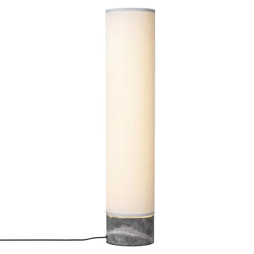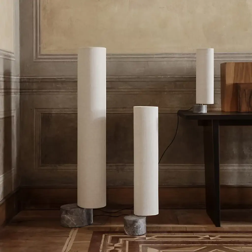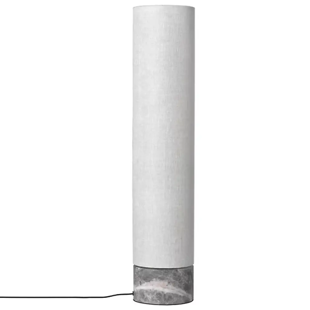Inspired by Japanese lanterns, the Unbound LED Floor Lamp from Gubi presents sophisticated materials in a playful composition. Creator Space Copenhagen brings a poetic modernism approach to the piece, one calling for the balancing of opposites. The floor lamp shows this opposites-attract approach by contrasting the base's texture-rich marble to the uniform textile shade. A 360-degree adjustable mechanism between the base and shade enhances the contrasting shapes with a perched, asymmetrical silhouette. The cylindrical shade transforms into a tower of ambiance that leaves a warm glaze on the marble's artful surface below.