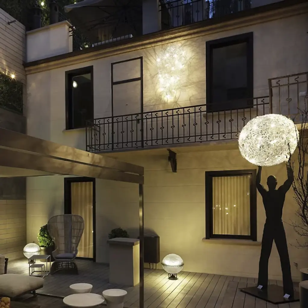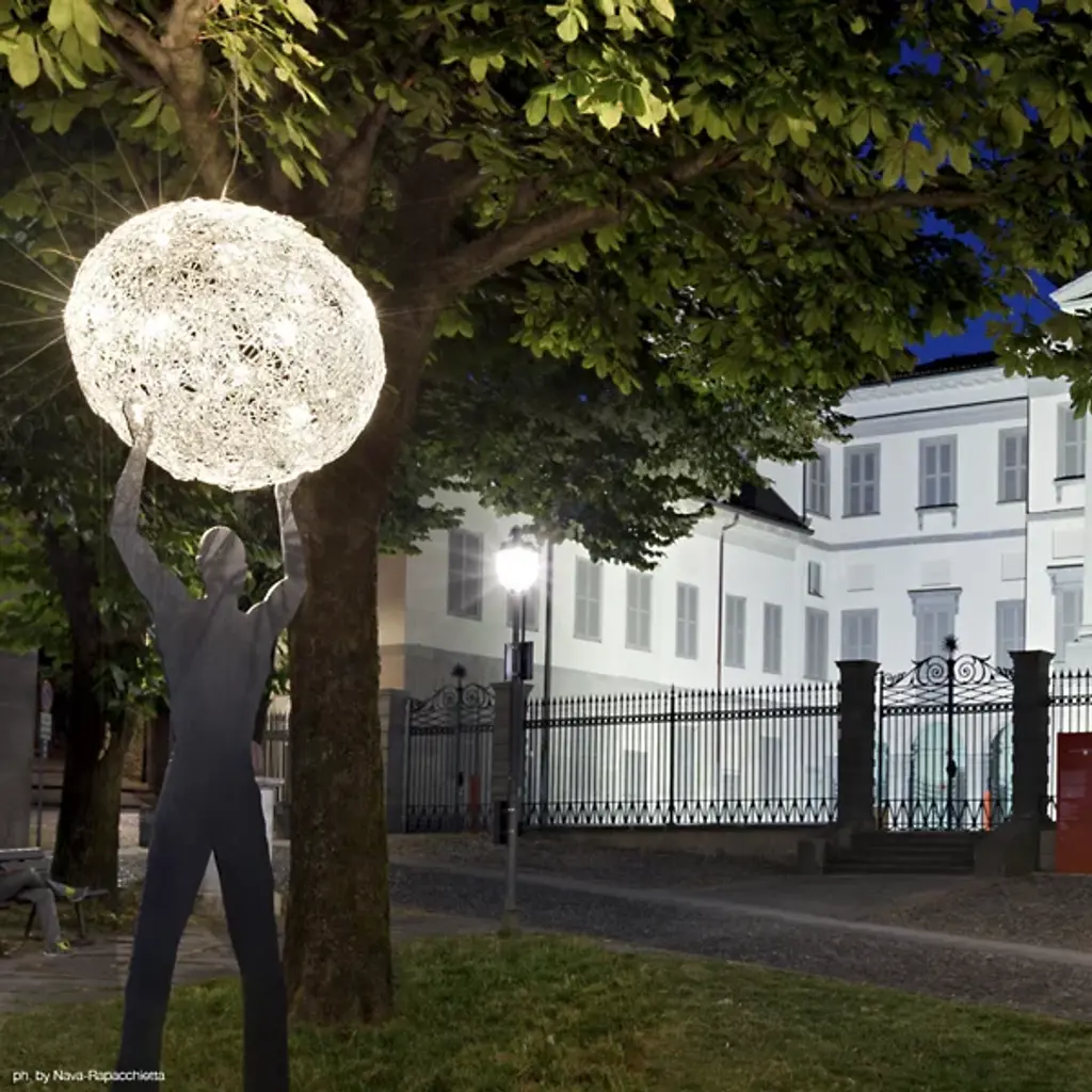 A stunningly composed masterpiece of illumination that could easily stand alone as an installation of art. The Uomo della Luce Outdoor Floor Lamp is handcrafted in Italy and presented by Catellani & Smith. A natural aluminum makes up the bodice in the silhouette of a human who holds up a sculpted ball of light. This magnificent piece of lighting would present as beautifully in a garden as it would in a gallery.
