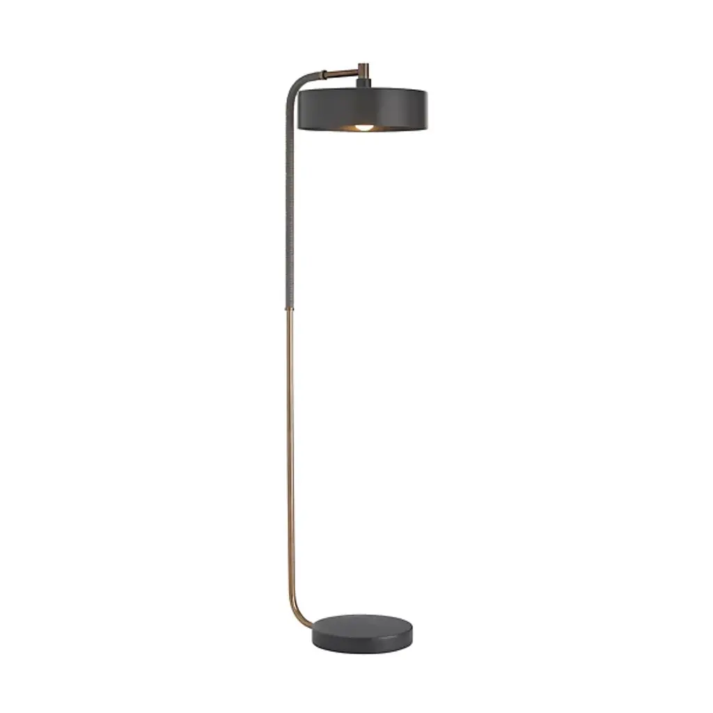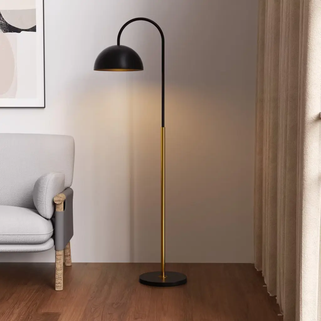 Providing a source of light in a captivating symmetry of shapes, this minimal floor lamp displays pure and rigorous lines with a stunningly simple dark burnished brass metal frame that occupies the space without invading it. The light source comes from a globe diffuser of white Murano glass enclosed in a perforated dome, also of dark burnished brass, suspended from a slender horizontal arm. The lamp supports a dimmable LED light bulb (6W E14 max 6W 470lm 2700°K) and is available also with light burnished brass structure and matte gold or matte black shade. The height of the lamp is adjustable.