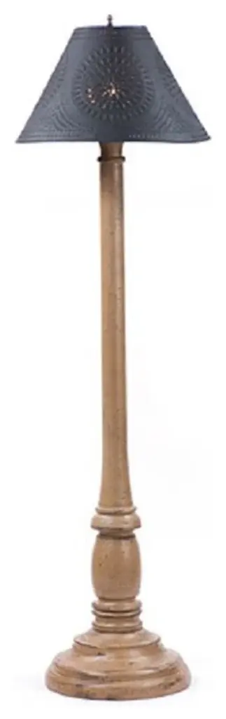 A slim beautiful wooden floor lamp that will grace your home with wonderful light patterns from the punched metal shade. The perfect piece to complete your room.Hand painted, lightly distressed finish. Center has 1 standard socket, 150 watts max. Includes 17 inch shade. Has a three-way switch, 7 ft cord, 8 inch harp and finial.Body is solid wood, arms are metal. USA Handcrafted Measures 59-Inches high x 17-Inches diameterHas a 7-foot cord and 3-way switch; Plugs into wall outlet; Standard socket, 1 x 150 watts maximum wattsBULBS ARE NOT INCLUDEDUL listed for dry locationsTextured paint finish; Shade includedLamp Base is made in the USA, Shade is Imported