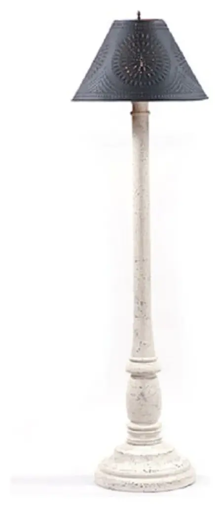 A slim beautiful wooden floor lamp that will grace your home with wonderful light patterns from the punched metal shade. The perfect piece to complete your room.Hand painted, lightly distressed finish. Center has 1 standard socket, 150 watts max. Includes 17 inch shade. Has a three-way switch, 7 ft cord, 8 inch harp and finial.Body is solid wood, arms are metal. USA Handcrafted Measures 59-Inches high x 17-Inches diameterHas a 7-foot cord and 3-way switch; Plugs into wall outlet; Standard socket, 1 x 150 watts maximum wattsBULBS ARE NOT INCLUDEDUL listed for dry locationsTextured paint finish; Shade includedLamp Base is made in the USA, Shade is Imported
