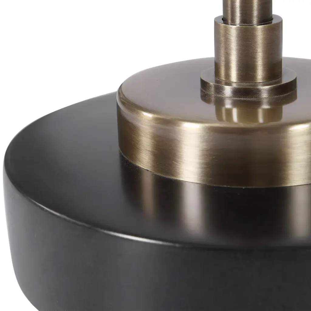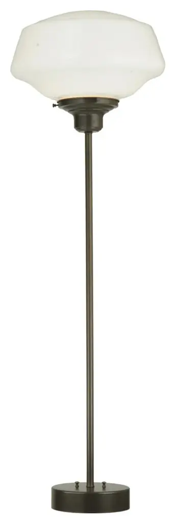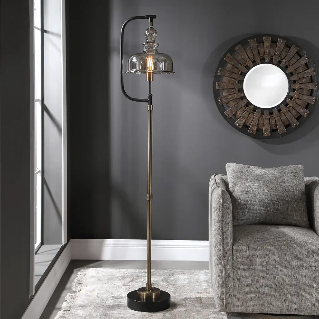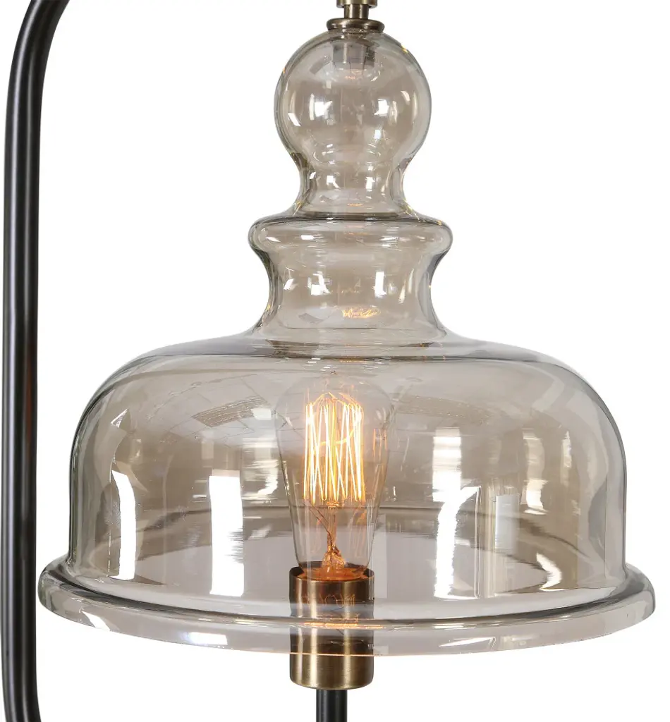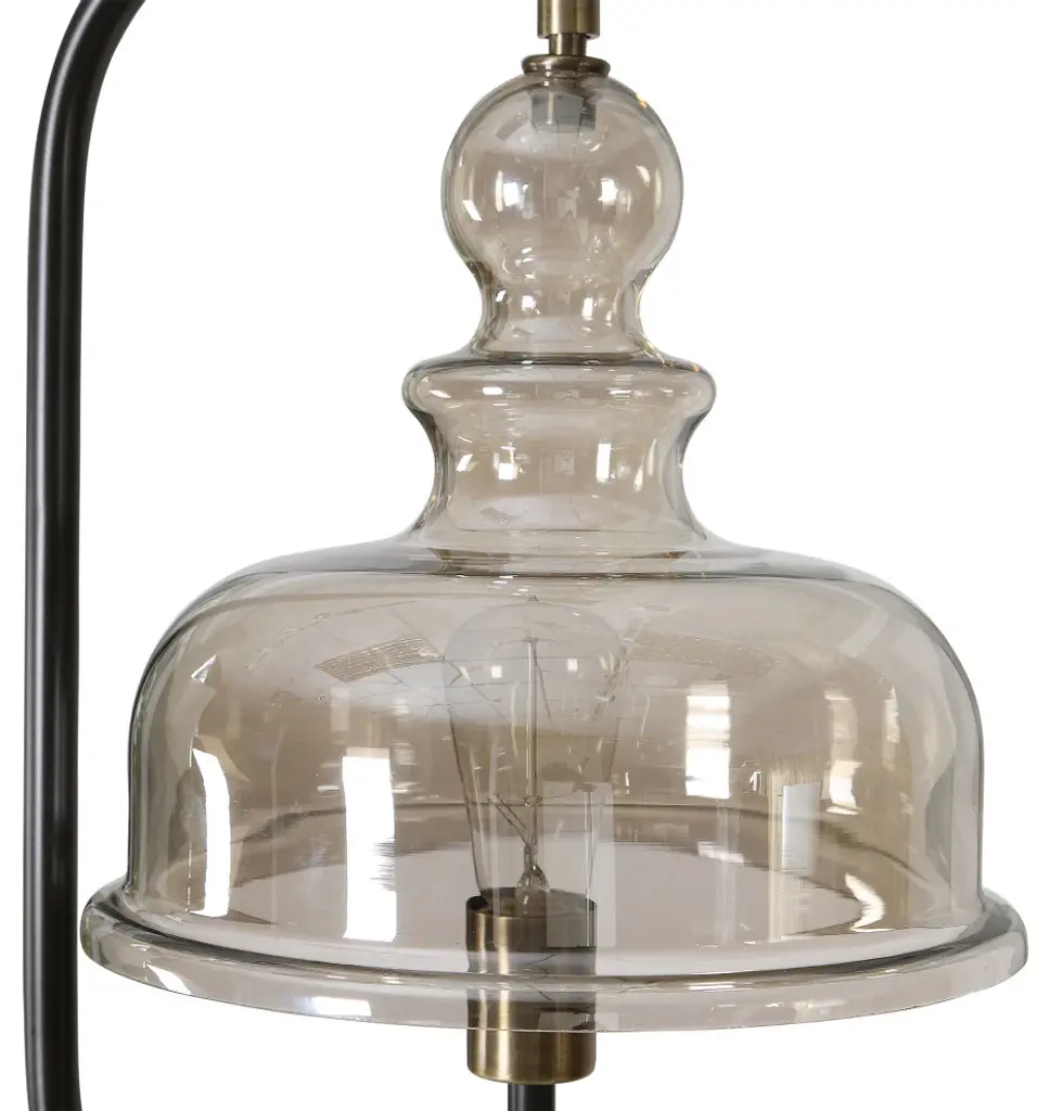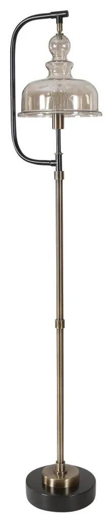 This floor lamp features a delicate design finished in a plated antiqued brushed brass and rusted aged black. The piece showcases a gracefully curved light amber glass shade and includes one 60 watt, BT-58 antique style bulb.Wattage: 60WBulb Type: TYPE ASocket Type: ON-OFFSwitch Type: FOOT SWITCH