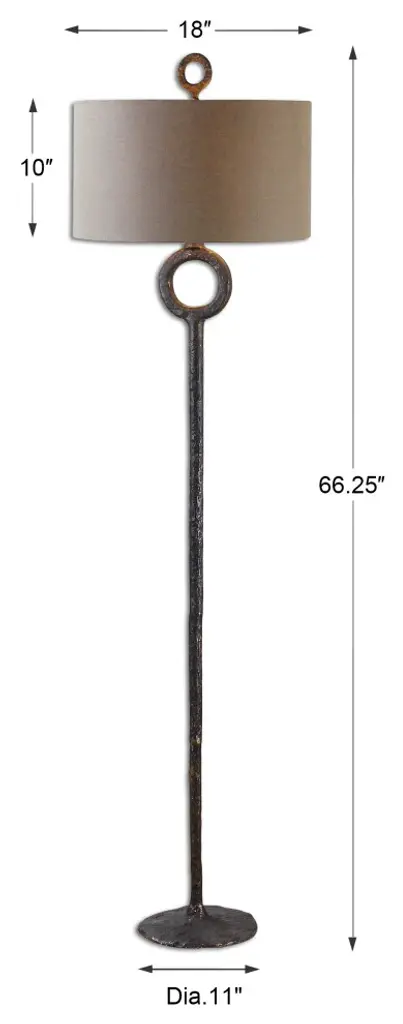 One Light Floor Lamp from Ferro collection in Aged Rust Bronze finish. Number of Bulbs 1. Max Wattage 150.00 . No bulbs included. Hammered Cast Iron Finished In An Aged Rust Brown. The Round, Hardback Shade Is A Rust Beige Linen Fabric. No UL Availability at this time.
