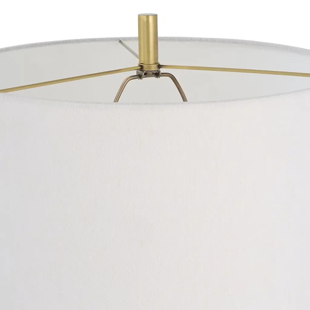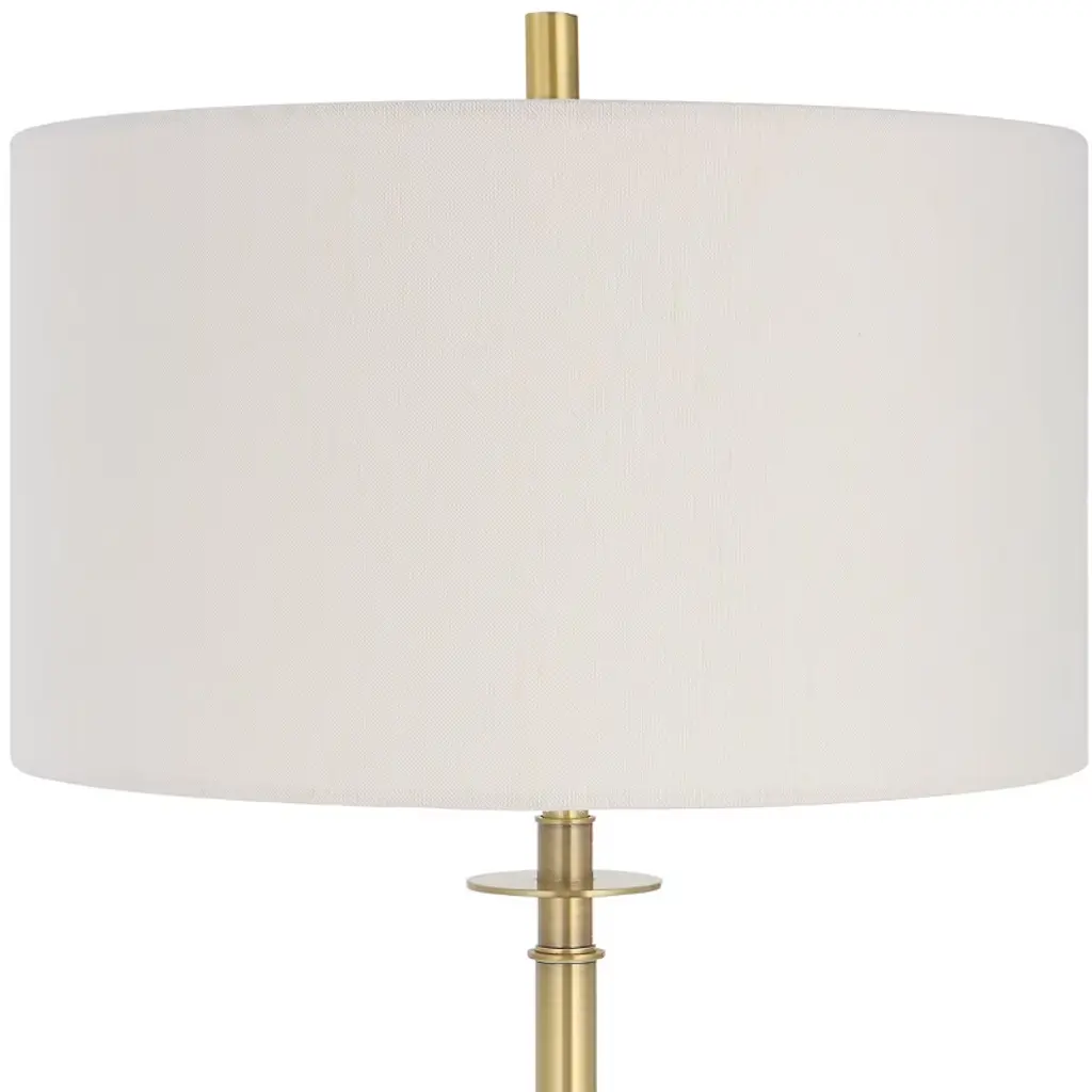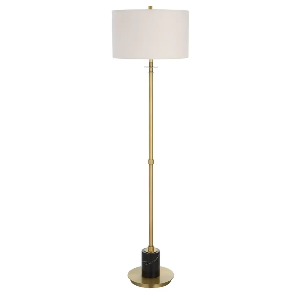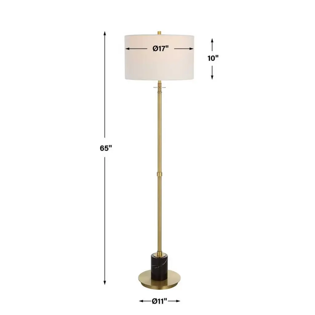 Elevate your interior with the Uttermost Guard Brass Floor Lamp, a refined combination of elegance and functionality. The lamp features a sleek iron base finished in lightly antiqued plated brass, accentuated by a substantial black marble column above the foot for a luxurious touch. The round hardback drum shade in white linen fabric softly diffuses light, creating a warm, inviting ambiance. Measuring 65"H × 17"W × 17"D, this floor lamp is ideal for living rooms, offices, or bedrooms, adding both sculptural presence and versatile illumination to contemporary and transitional interiors. Product Features: Material: Iron base, black marble column, linen shadeColor: Lightly antiqued brass, black marble, white shadeFinish/Frame: Plated brass with natural marble accentDimensions: 65"H × 17"W × 17"DShade: Round hardback drum, 10"H, top 17"W × 17"D, bottom 17"W × 17"DBulb: 150W, 1 TYPE A, 3-way socketStyle Match: Contemporary, transitional, modern interiors