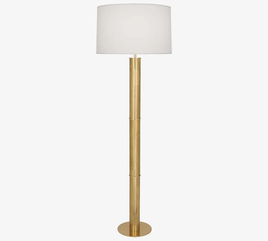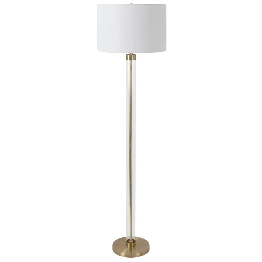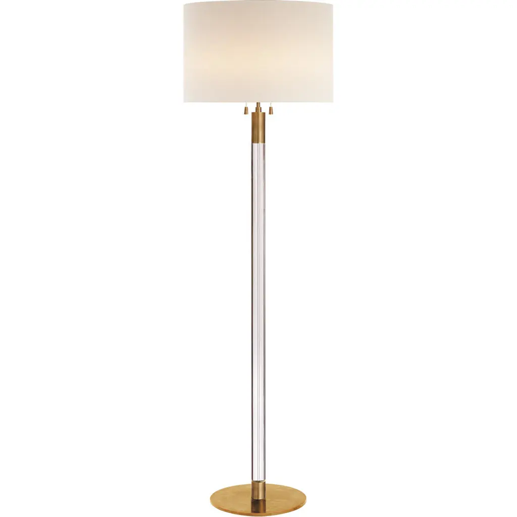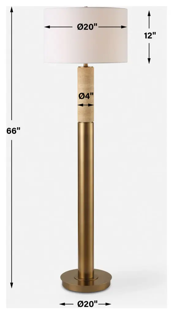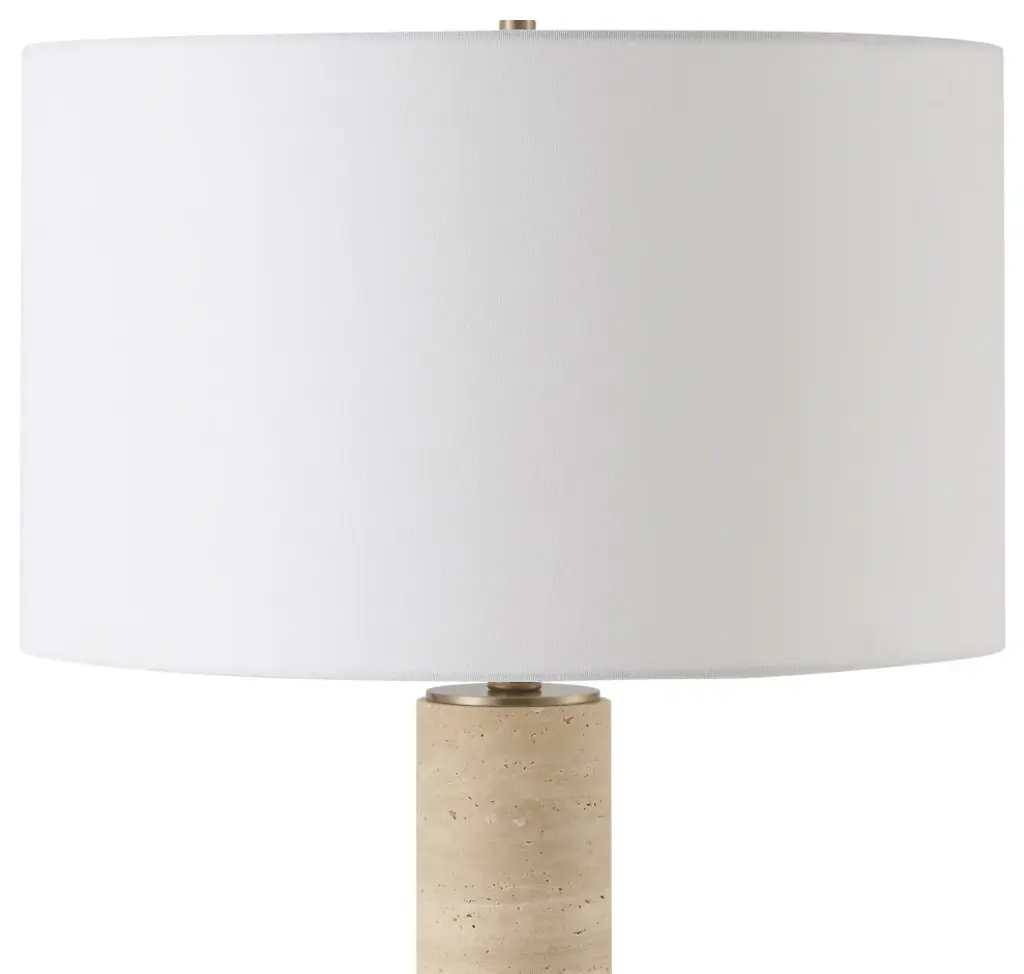 The Knox Floor Lamp Showcases A Solid Travertine Column Displayed On A Matching Antique Brass Plated Body. The Round Hardback Drum Shade Is A Casual White Linen Fabric.
