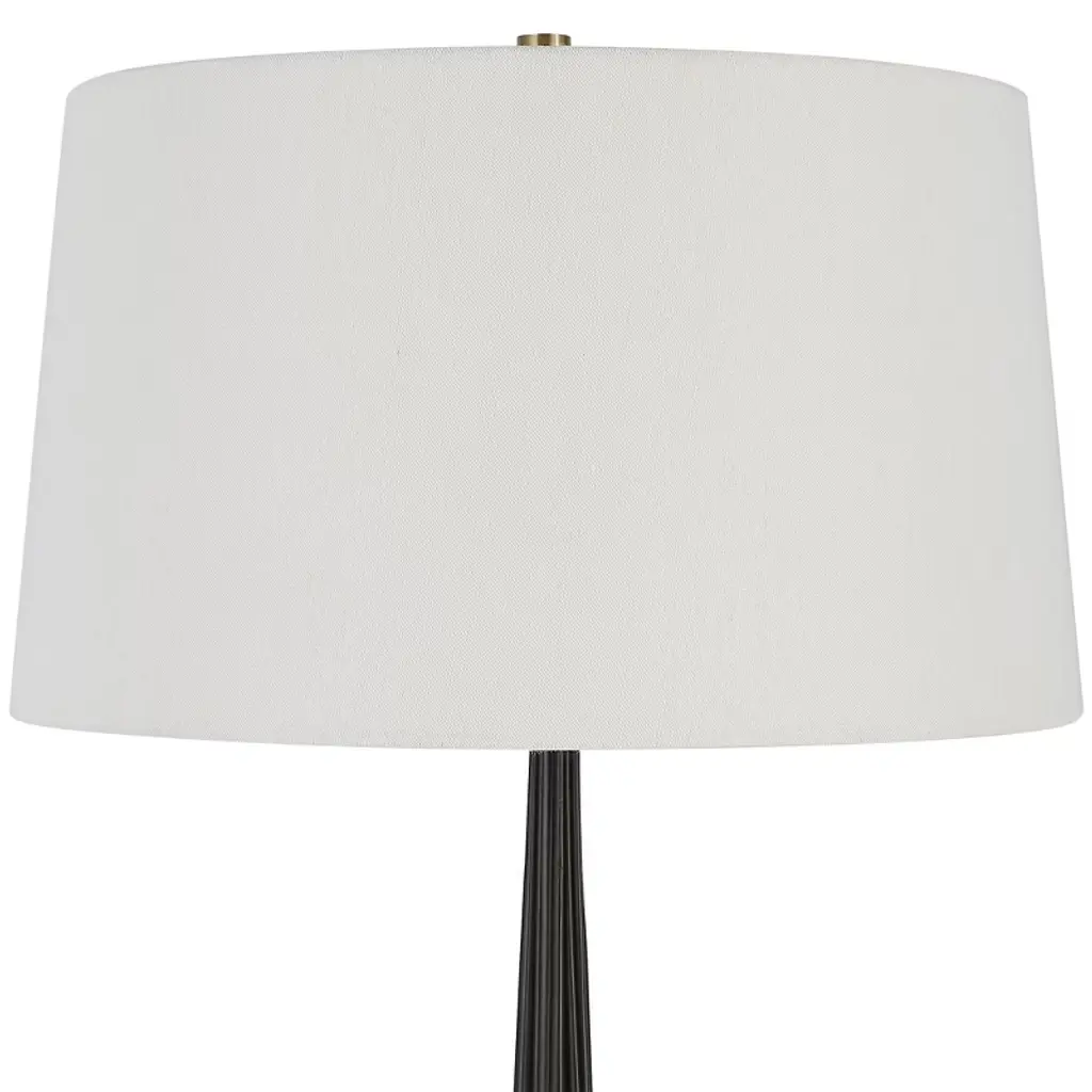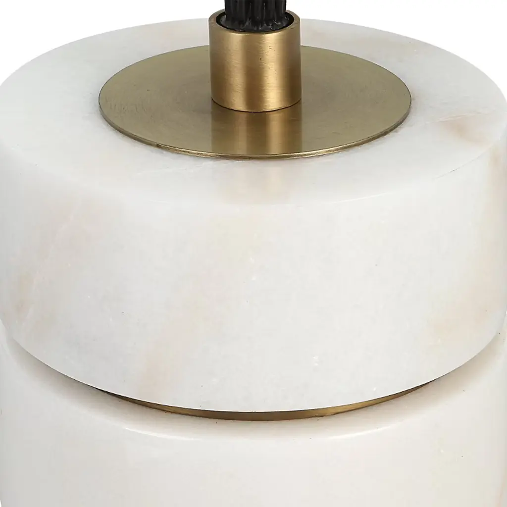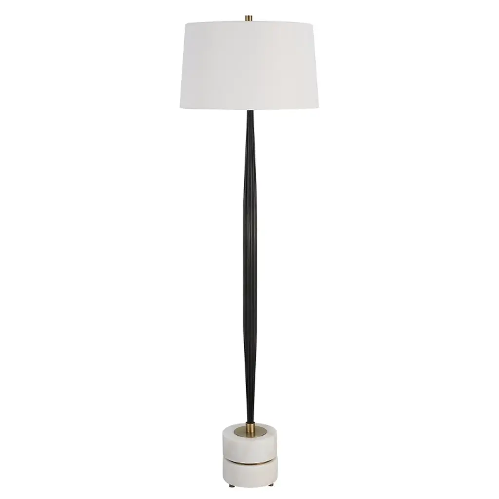 Add a touch of sophistication to your interiors with the Uttermost Miraz Iron Floor Lamp. Featuring a channeled cast iron base with brushed brass accents and a substantial white marble foot, this floor lamp exudes elegance and durability. The tapered round hardback shade in white cotton fabric softly diffuses light, creating a warm and inviting ambiance. Standing 65.75"H × 19"W × 19"D, the Miraz lamp is ideal for living rooms, offices, or bedrooms, combining functional lighting with a bold sculptural presence that complements contemporary, transitional, and modern decor. Product Features: Material: Channeled cast iron base, white marble foot, cotton fabric shadeColor: Black iron base, brushed brass accents, white shadeFinish/Frame: Brushed brass accents with polished marbleDimensions: 65.75"H × 19"W × 19"DShade: Round hardback drum, 11"H, top 17"W × 17"D, bottom 19"W × 19"DBulb: 150W, 1 TYPE A, 3-way socketStyle Match: Contemporary, transitional, modern interiors