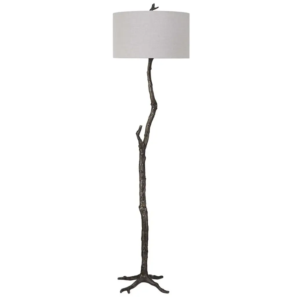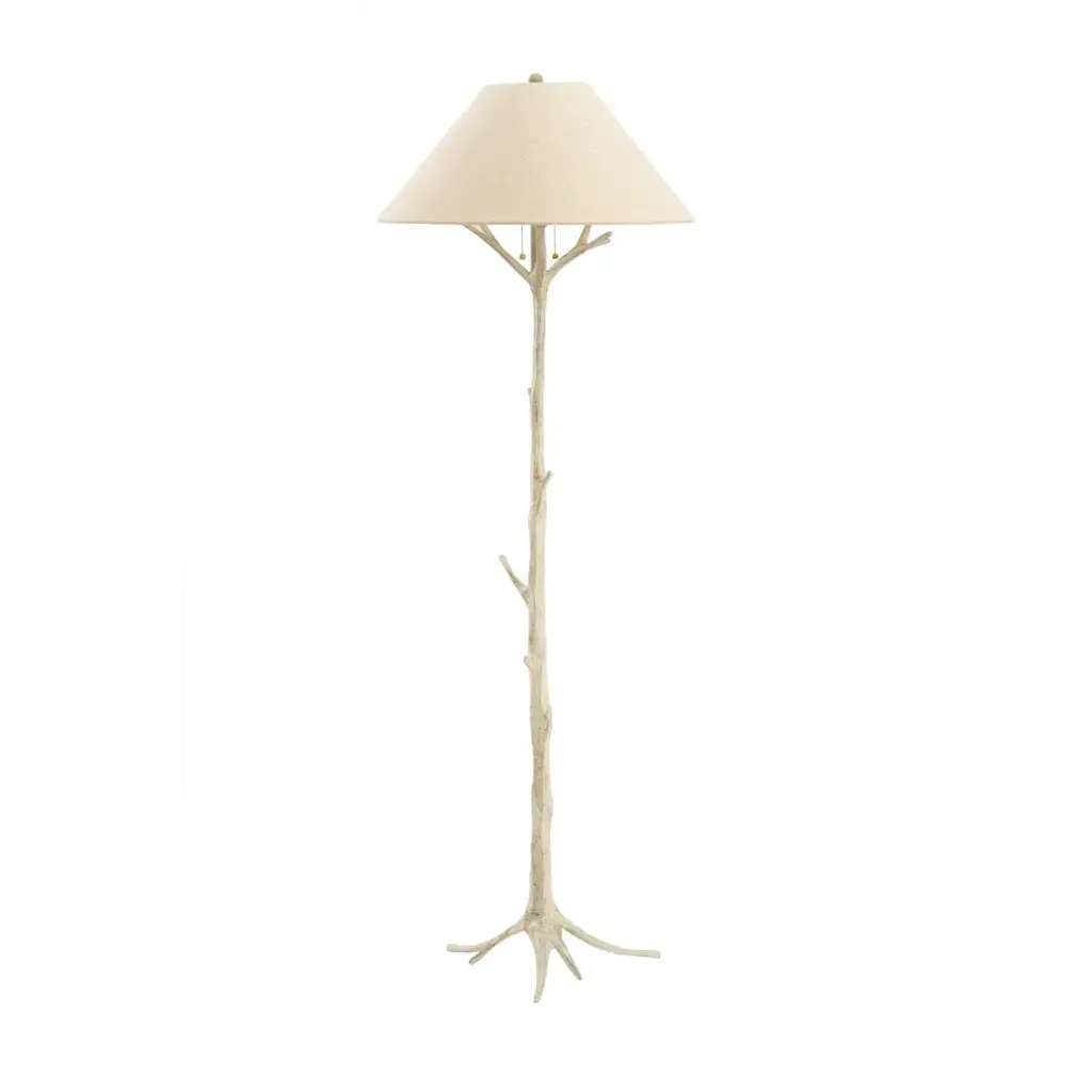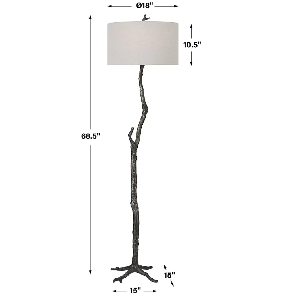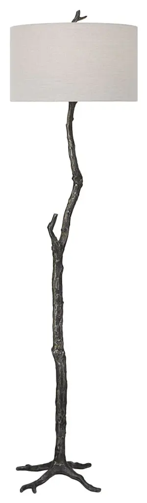 Rooted in organic elegance, the Spruce Rustic Floor Lamp brings the essence of nature indoors with refined craftsmanship. Handcrafted from cast iron, the lamp features sculpted details reminiscent of tree branches, finished in a distressed rustic black with subtle silver undertones. The intricate textures evoke woodland serenity while maintaining a sophisticated presence. Key Features: Cast iron body with tree-inspired sculpted textures and rustic black finish. Silver undertones subtly highlight the organic detailing. Light gray linen hardback drum shade adds soft contrast. 3-way socket switch supports layered lighting up to 150W. Dimensions: 69" H; Shade: 11" H x 18" Dia; Weight: 30 lbs.