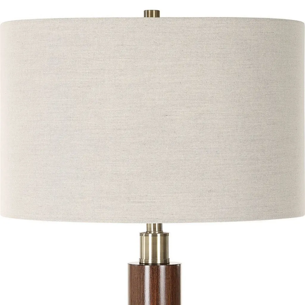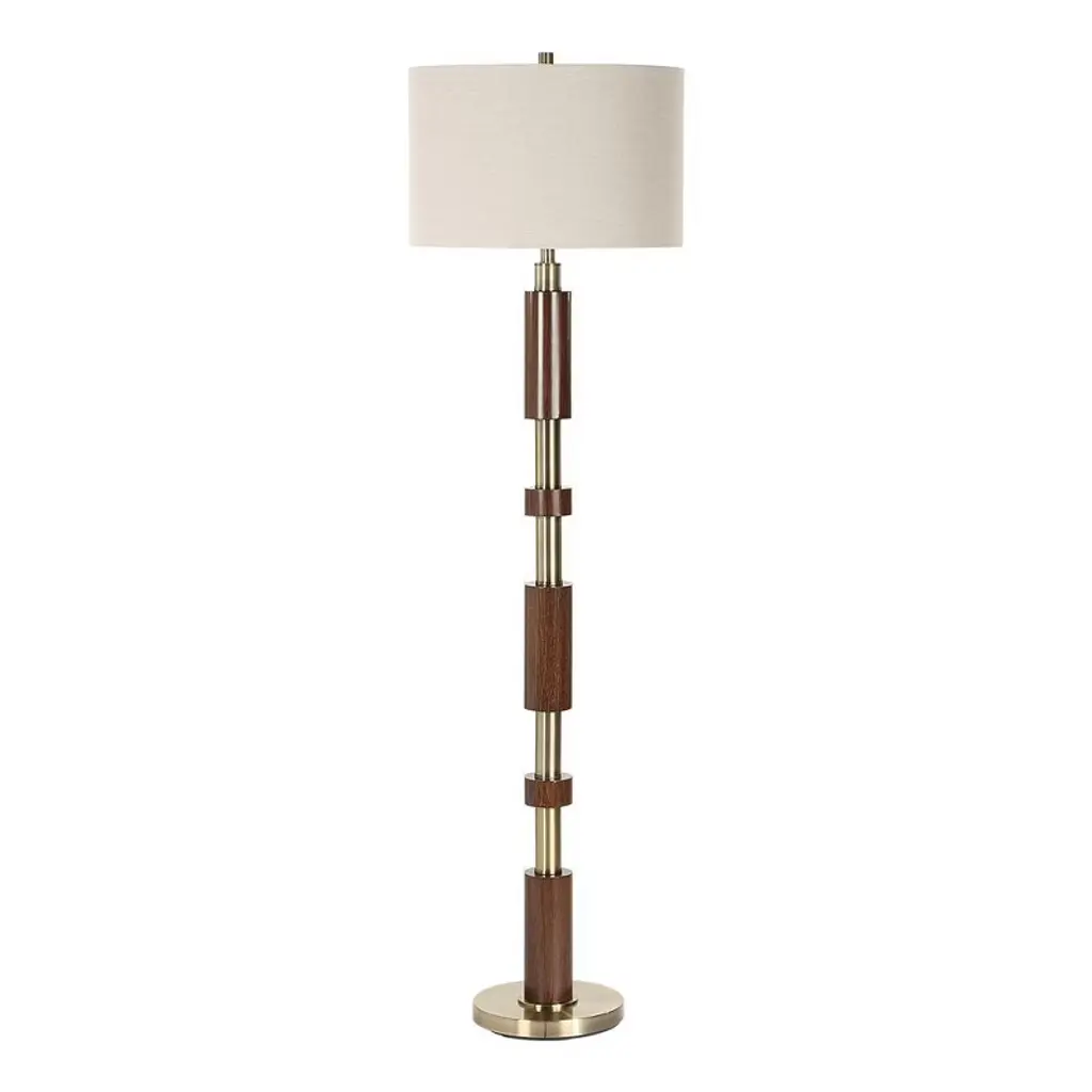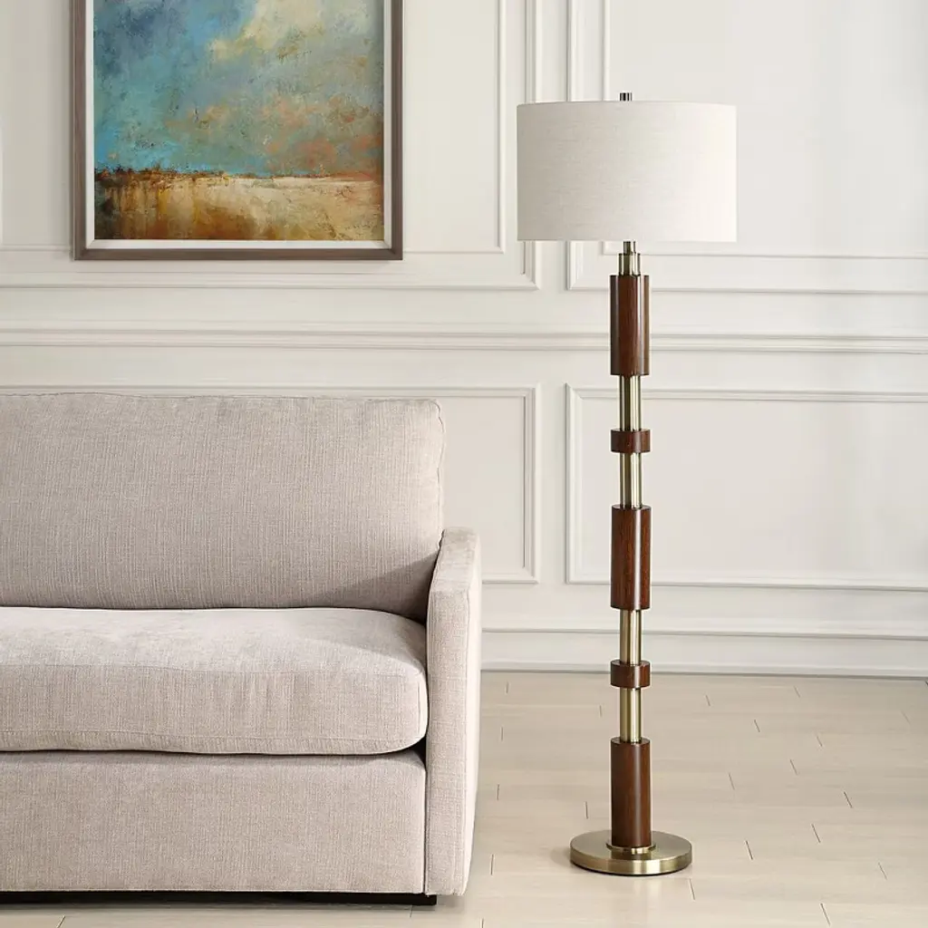 The Stacked Wooden Floor Lamp blends architectural precision with organic warmth in a design that echoes classic Mid-Century aesthetics. Featuring alternating stacked wooden cylinders and sleek brass plated detailing, this lamp offers a dynamic silhouette that draws the eye in any modern or transitional space. Key Features: Architectural stacked wood design with brass plated accents for Mid-Century flair. White linen drum shade delivers soft, even lighting. 3-way socket switch allows lighting customization up to 150W. Clean silhouette suits modern, transitional, and minimalist interiors. Dimensions: 63" H; Shade: 11" H x 18" Dia; Weight: 22 lbs.