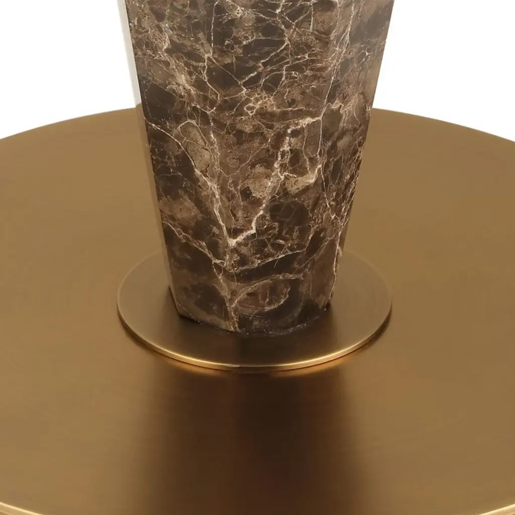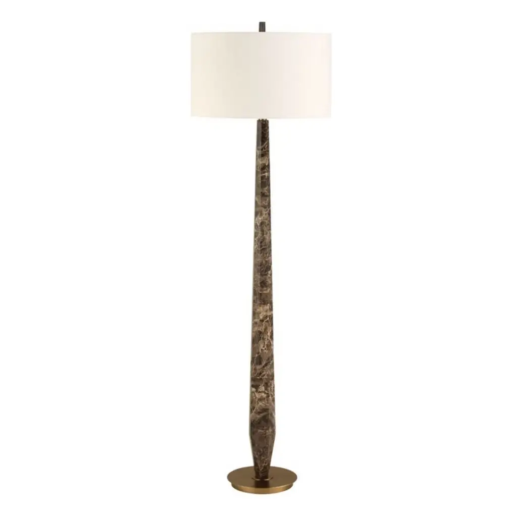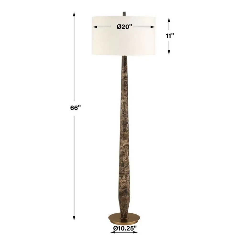 Tyree Floor Lamp-Faceted Brown Marble with Off-White Linen Shade Elevate your space with the rich character of the Tyree Floor Lamp. Carved from genuine Emperador brown marble, its faceted base showcases warm tonal variations and intricate veining, making each piece a one-of-a-kind statement. Accented with brass-plated details and grounded by a matching foot, this sophisticated lamp is topped with an off-white hardback drum shade in slubbed linen for natural texture. An elegant fusion of earthy luxury and modern design. Key Features: Authentic Emperador Marble: Faceted brown marble with natural veining ensures uniqueness. Elegant Contrast: Brass-plated accents add warmth and refinement. Textured Linen Shade: Off-white hardback drum shade with subtle slubbing diffuses light beautifully. Functional Illumination: E26 standard socket supports up to 150W with 3-way switch (bulb not included). Generous Height: Perfectly scaled to illuminate reading nooks, corners, or behind sofas. Dimensions: 66" H x 20" W x 20" D A luxurious, organic-inspired lighting piece designed to bring warmth and distinction to any interior.