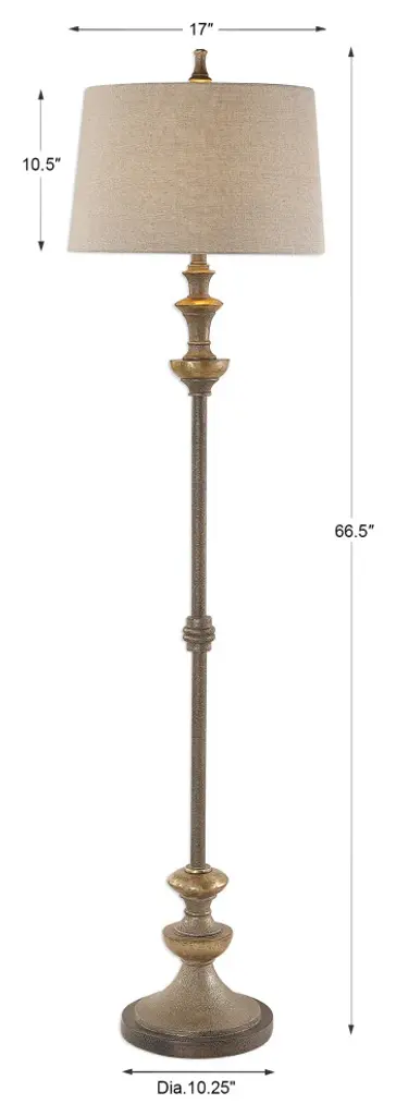 One Light Floor Lamp from Vetralla collection in Dark Bronze finish. Number of Bulbs 1. Max Wattage 150.00 . No bulbs included. This Floor Lamp Features Heavily Burnished Textured Silver Details, Paired With Antiqued Silver Champagne Accents And A Crackled Dark Bronze Foot. The Tapered Round Hardback Shade Is An Ivory Linen Fabric. No UL Availability at this time.