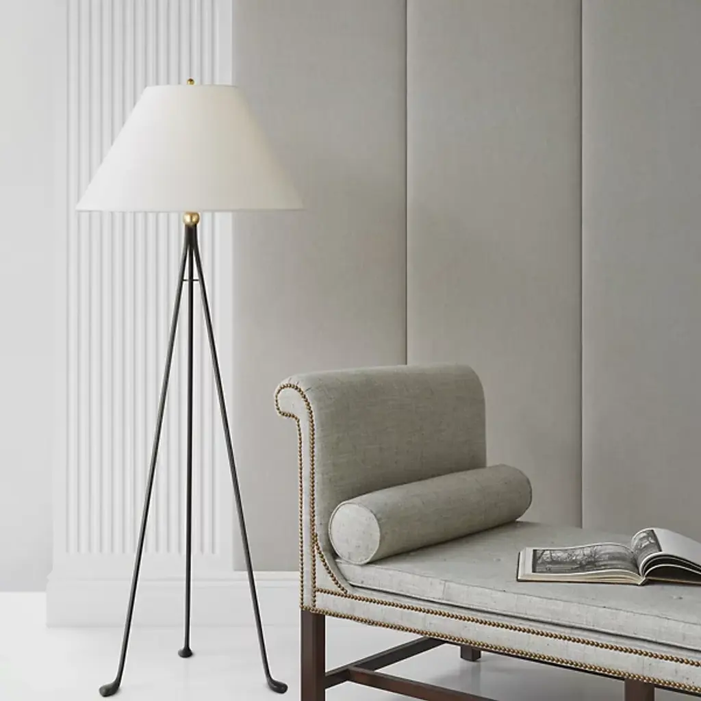 Drawing inspiration from French ironwork of the mid-20th century, the Valley Floor Lamp from Visual Comfort Signature, designed by Champalimaud, exudes timeless elegance. Its aged iron tripod base gracefully ascends to a gilded brass spherical accent just below the conical shade, creating a chic silhouette. With a vintage quality that adds a touch of nostalgia, this unique lamp becomes a captivating accent in any room.