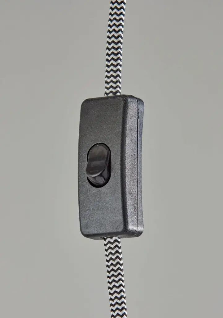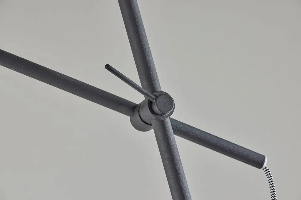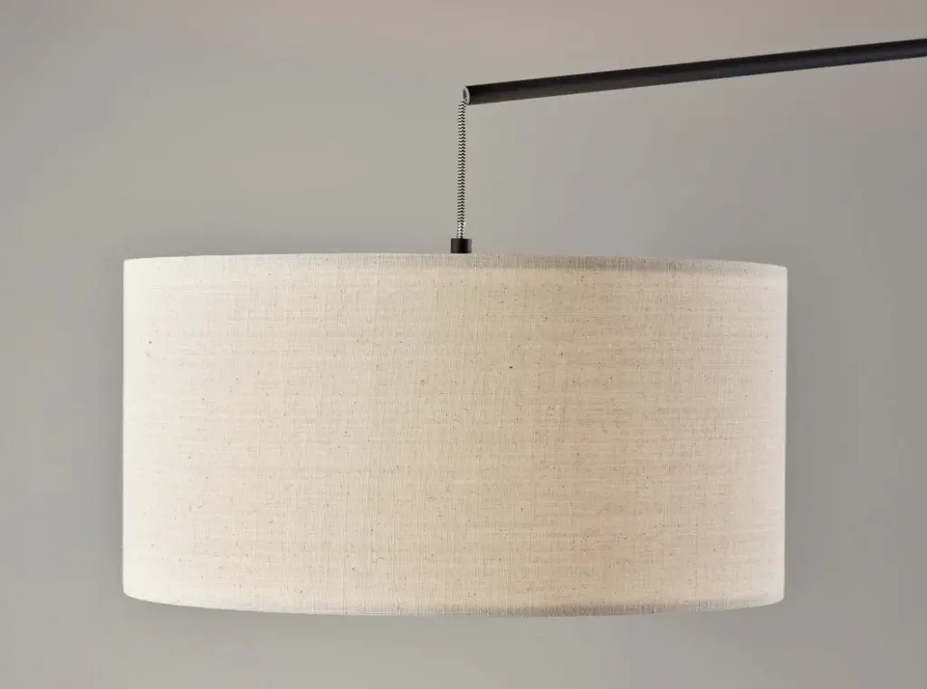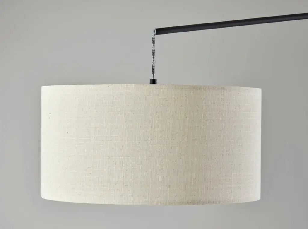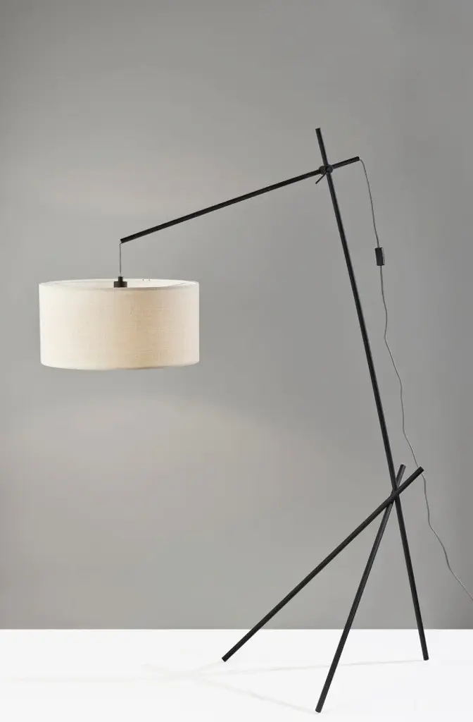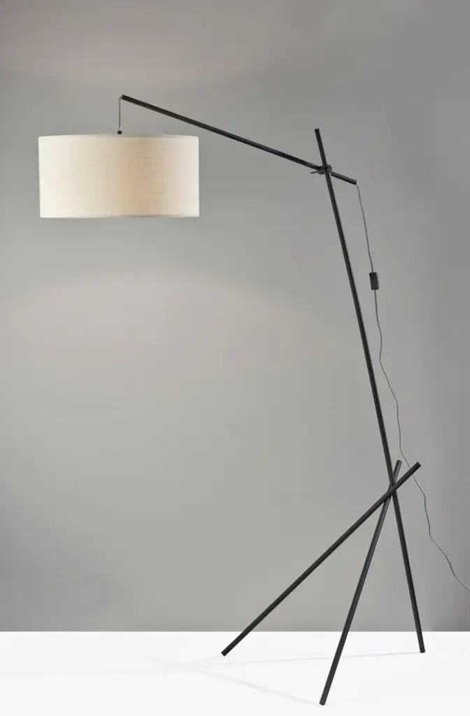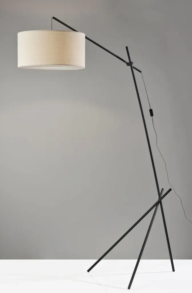 Design, function, and rich materials are perfectly balanced in the Varick floor lamp. Crafted of black metal, the lamp''s triangular footprint and adjustable arm create a dramatic silhouette. The black and white fabric-covered cord not only powers the lamp but adds to the design, visibly running up to the boom arm and connecting the arm to the suspended lamp shade. The short drum shade measures 20" in diameter and is made of beige linen for a textured look. A white diffuser ensures soft and even lighting from a 100W bulb. For added versatility, the boom arm features an articulation point, allowing you to adjust the angle of the arm and height of the shade for a variety of looks and lighting options.The lamp is well suited for illuminating a sectional or loveseat from above.The striking silhouette and monochrome metal construction complement mid-century modern and industrial décor.The linen shade and diffuser ensure soft, even lighting.An articulation point allows you to adjust the angle of the boom arm and height of the shade.The lamp is operated by an in-line rocker switch.100W