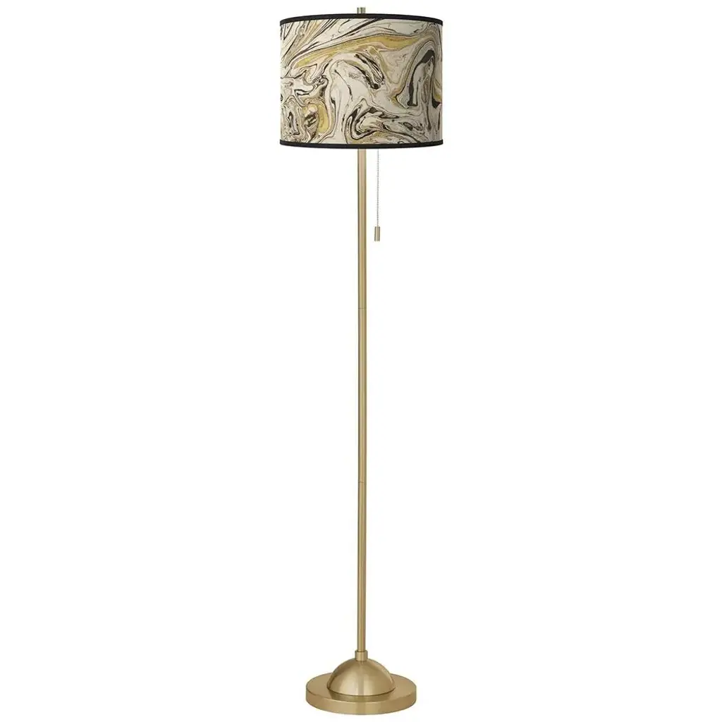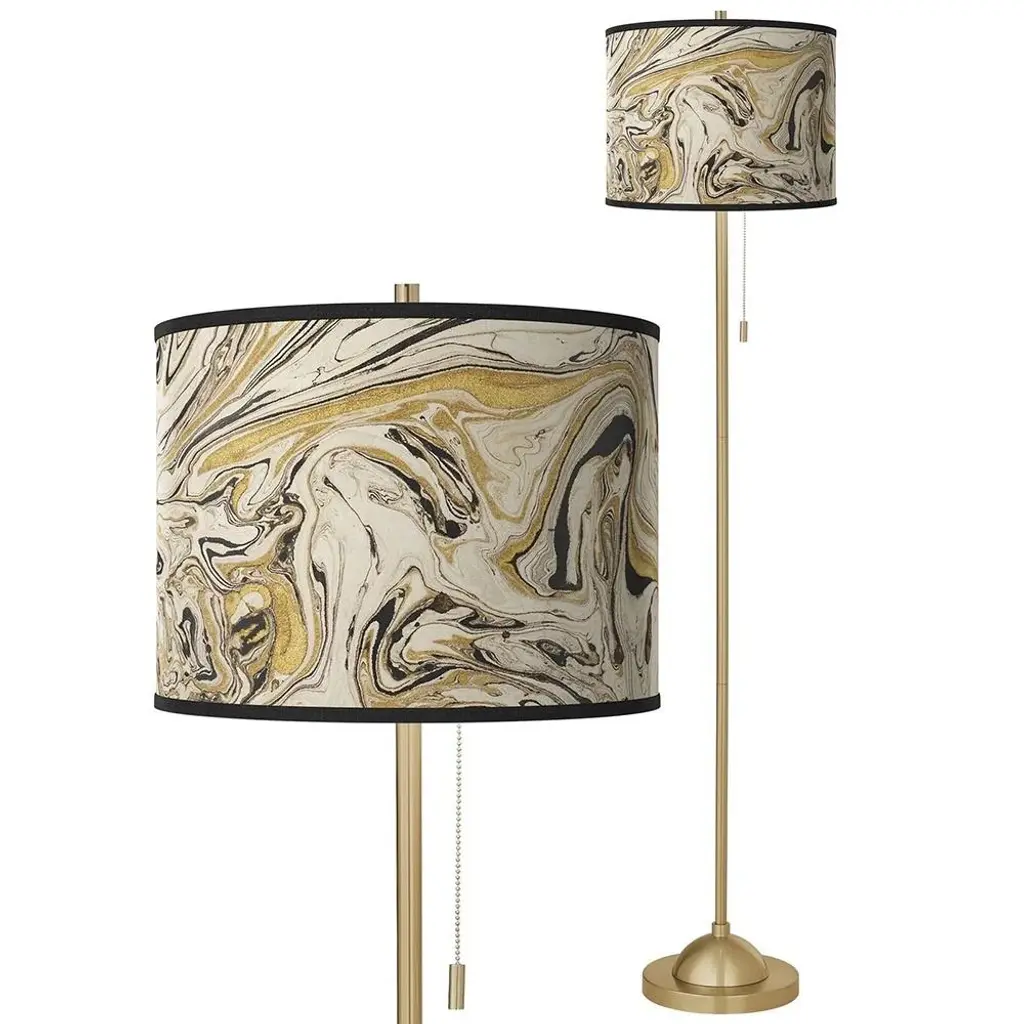 PRODUCT DETAILS: 62" high overall. Drum shade is 13 1/2" wide across the top and bottom x 10" high. Base is 10" wide x 1 1/4" high. Weighs 12 lbs. Uses one maximum 100 watt standard-medium base light bulb (not included). On-off pull chain for easy lighting control. Stick floor lamp from the Giclee Glow brand. Custom printed Venetian Marble shade. Shade printing process U.S. Patent # 7,347,593. Warm gold finish. 8-foot long cord. DESCRIPTION: Brighten your home with this modern style stick floor lamp. It features a warm gold finish and is topped by a classic drum shade for a clean look. The shade has an exclusive Venetian Marble pattern and is giclee printed and made to order. An on-off pull chain switch allows for easy lighting control.