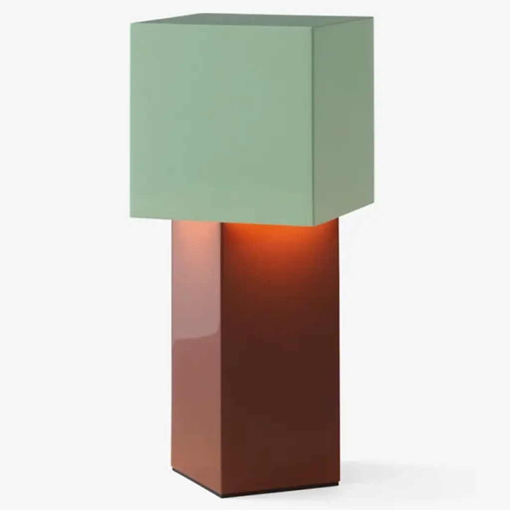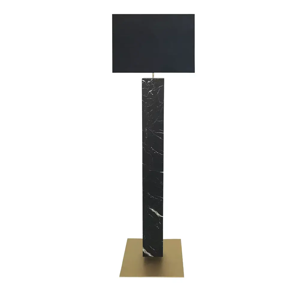 Creating an eye-catching focal point in any contemporary living room, this remarkable floor lamp boasts an exquisite combination of neat and essential lines and elegant hues. Fashioned of wood, it rests on a black-lacquered base supporting a tall and thick stem veneered with a checkered inlay work painted in delicate tones of pink, beige, and brown. This splendid design is completed with a rectangular black fabric drum shade.