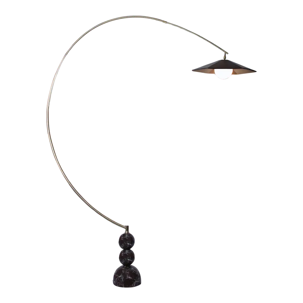 Arc floor lamp is a revival of 1960s Italian forms with a postmodern twist. "Venus harkens back to a Grace-Jones-in-the-'80s vibe," explains NYC-based designer Farrah Sit. Sculpted from Italian Arabescato marble, sharp angular base is balanced by one continuous champagne brass rod that softly arcs over the fixture. Using materials that are cool to the touch, Sit's work contrasts basic geometric shapes that reflect postmodern motifs. CB2 exclusive.