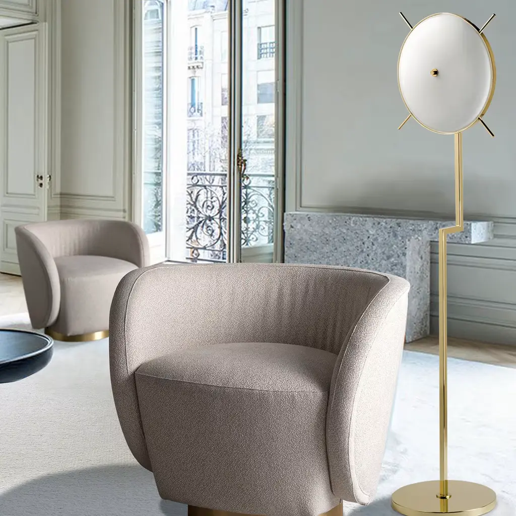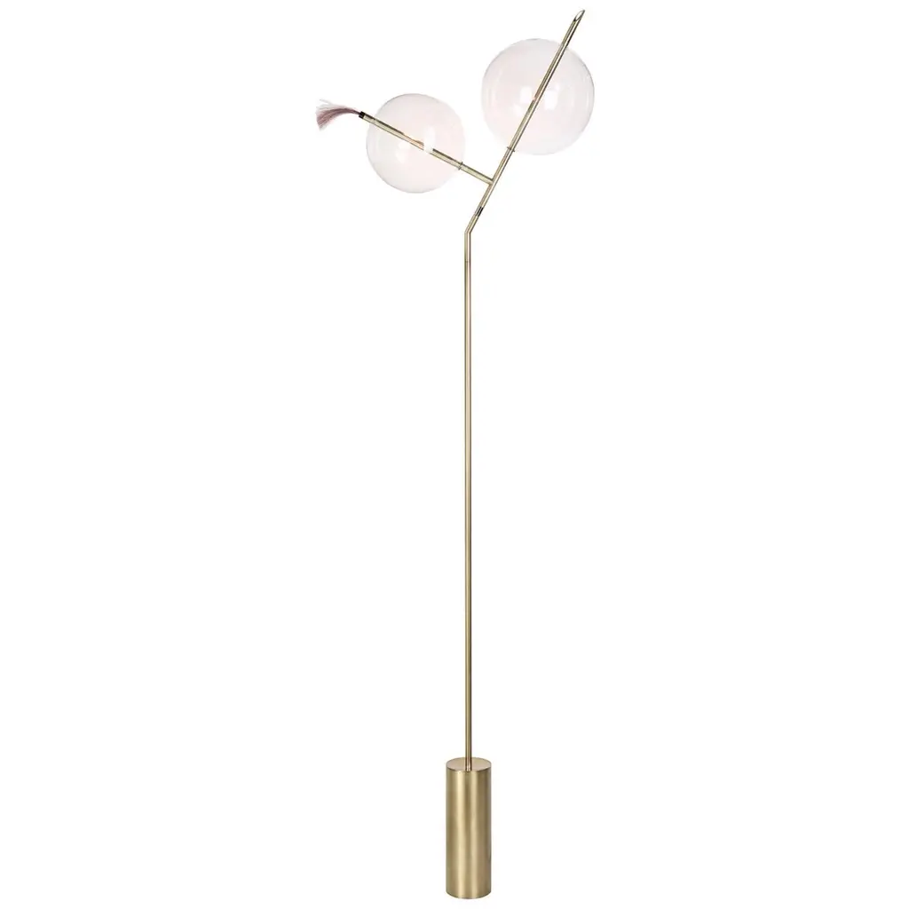 Part of the Home Couture Collection, this stunning floor lamp boasts a design inspired by Art Deco elegance and bold luxury. Its sculptural structure in brass features a round base a stem enlivened by an L-shaped insert. The brass serves as mounting for the stunning mouth-blown Murano glass diffuser, holding two lights, embellished outside with four brass spikes.