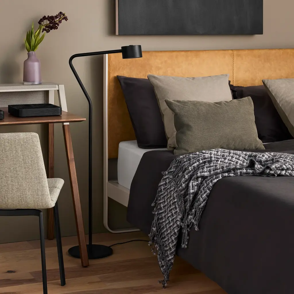 A meandering powder-coated steel stalk bends to brighten up your space. Cute and compact, its animated body emanates effervescent illumination right where you need it. Touch switch adds tactile fun and creates a trilogy of golden light.