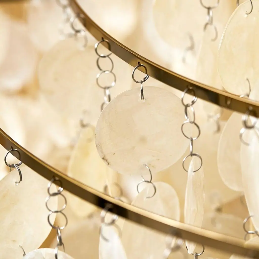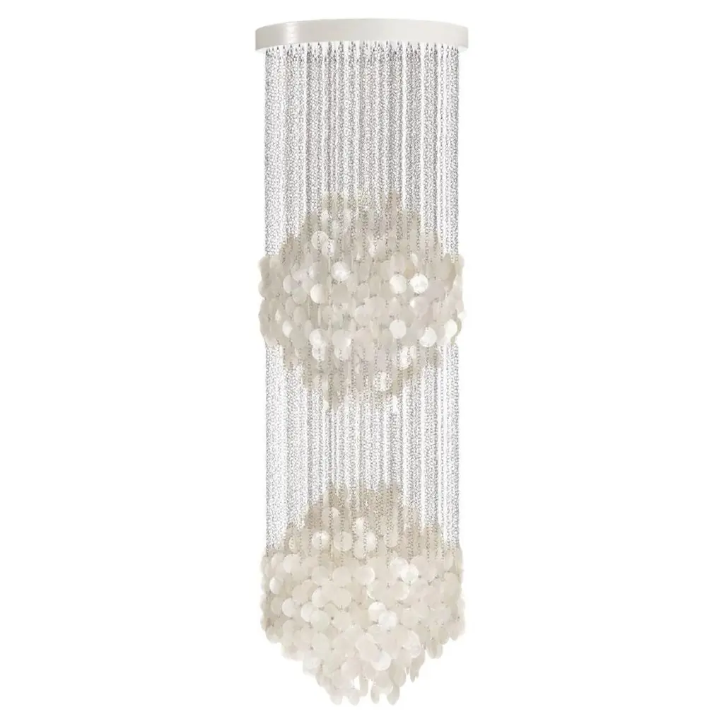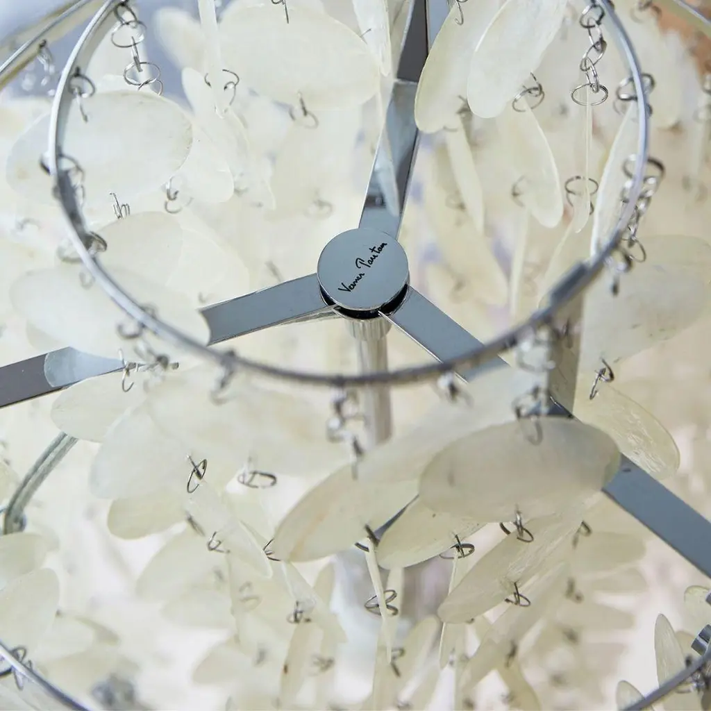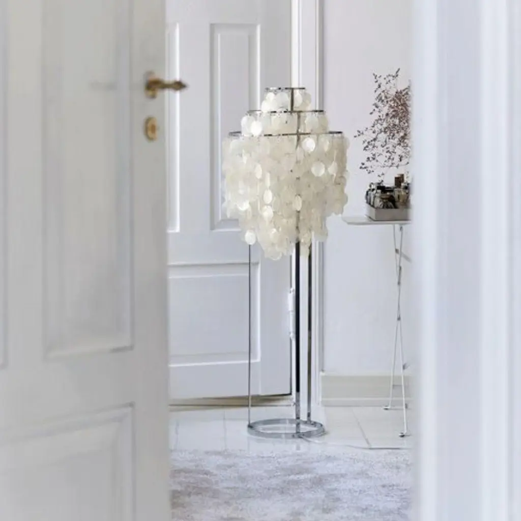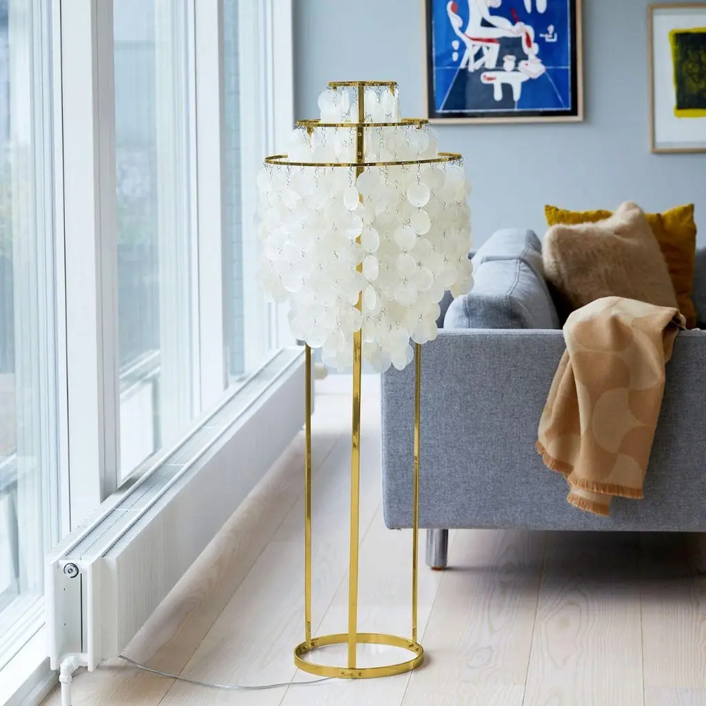 Verner Panton 'Fun 1STM' floor lamp in sea shells and brass for VerpanVerner Panton was one of Denmark's most legendary modern furniture and interior designers. His innovative experimentation with new materials, bold shapes and vibrant colors shines through in his most iconic pieces, faithfully and sustainably re-editioned by Verpan since 2003. First designed in 1964, the 'Fun 1STM' has long been considered Panton's greatest masterpiece in lighting design. Featuring 3 brass rings from which an array of circular sea shells are artfully suspended from, the 'Fun 1STM' highlights the unmistakable brilliance of Panton. Created to be equally appealing whether illuminated or not, the 'Fun 1STM' is executed in a brass plated structure, sea shells and stainless steel rings to the exacting standards of Verpan using the finest materials available.Price per item. Available in unlimited quantities in brass or chrome, as well as in table, sconce, floor, pendant and chandelier variations - please see our separate listings. This listing is for the 'Fun 1STM' table lamp in brass, sea shells and stainless steel.In stock lead time 2-4 weeks. Out of stock can add an additional 8 weeks or more. Please note that lead times, cost and inventory availability are subject to change without notice. Please contact us for current lead times prior to placing time-sensitive orders.Accommodates single standard medium base E26 bulb (bulb not included). Max 60 watt, lower with incandescent. Powered by 7.1' cord with integrated on/off switch. This lamp is UL listed.Made to order. All sales are final.